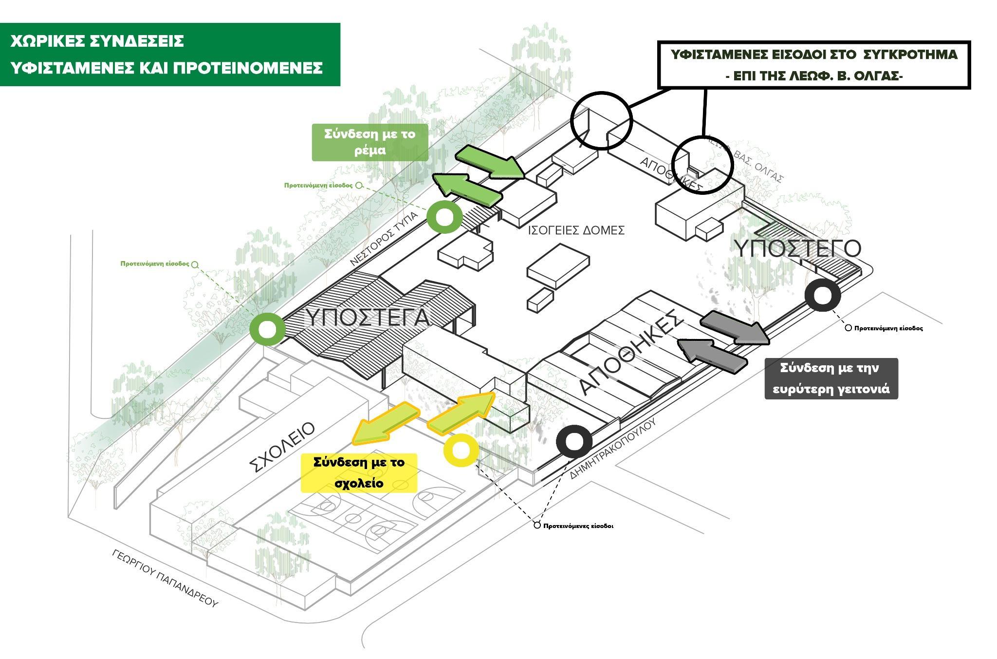 Για την υλοποίηση αυτής της συνθήκης προτάθηκαν χώροι διοίκησης του Ντεπώ, σημεία εξυπηρέτησης και πληροφόρησης του κοινού και ενημερωτικά περίπτερα ή σημάνσεις (stands, info-points, κ.λπ.). Επίσης, προτάθηκε η δημιουργία co-working spaces και γραφείων τα οποία θα μισθώνονται βραχυπρόθεσμα από πολίτες, κοινωνικές οργανώσεις, επιχειρήσεις start up κτλ.. Πρόσβαση / Συνδέσεις Η πρόσβαση στο χώρο του Ντεπώ και η σύνδεσή του με την γειτονιά ήταν θέματα που απασχόλησαν πολλές ομάδες. Οι σχετικές προτάσεις αποτύπωσαν νέες δυνατότητες πρόσβασης στον υπό μελέτη χώρο, πέρα από την κύρια είσοδο, σε χαρακτηριστικά σημεία των υπόλοιπων πλευρών: επί της οδού Δημητρακοπούλου, από το σχολείο και το ρέμα της Νέστορα Τύπα Χαρακτηριστική ήταν η ανάγκη όλων