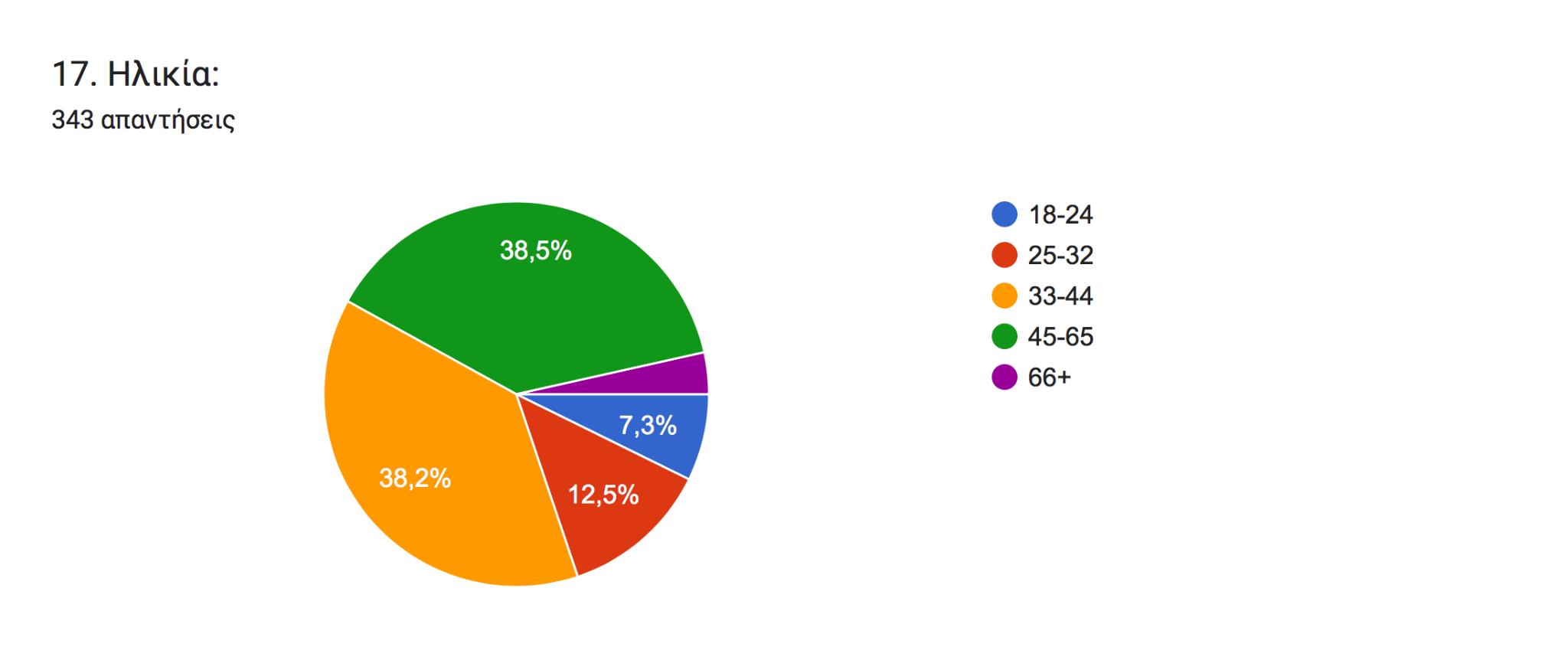 Ερώτηση νο17 (πηγή: Google Forms) Στο ερώτημα 17 “Ηλικία:” απάντησαν 343 άτομα 132 άτομα απάντησαν “45-65”, 131 απάντησαν “33-44”, 43 άτομα “25-32”, 25 άτομα “18-24” και 12 άτομα απάντησαν “66+”.