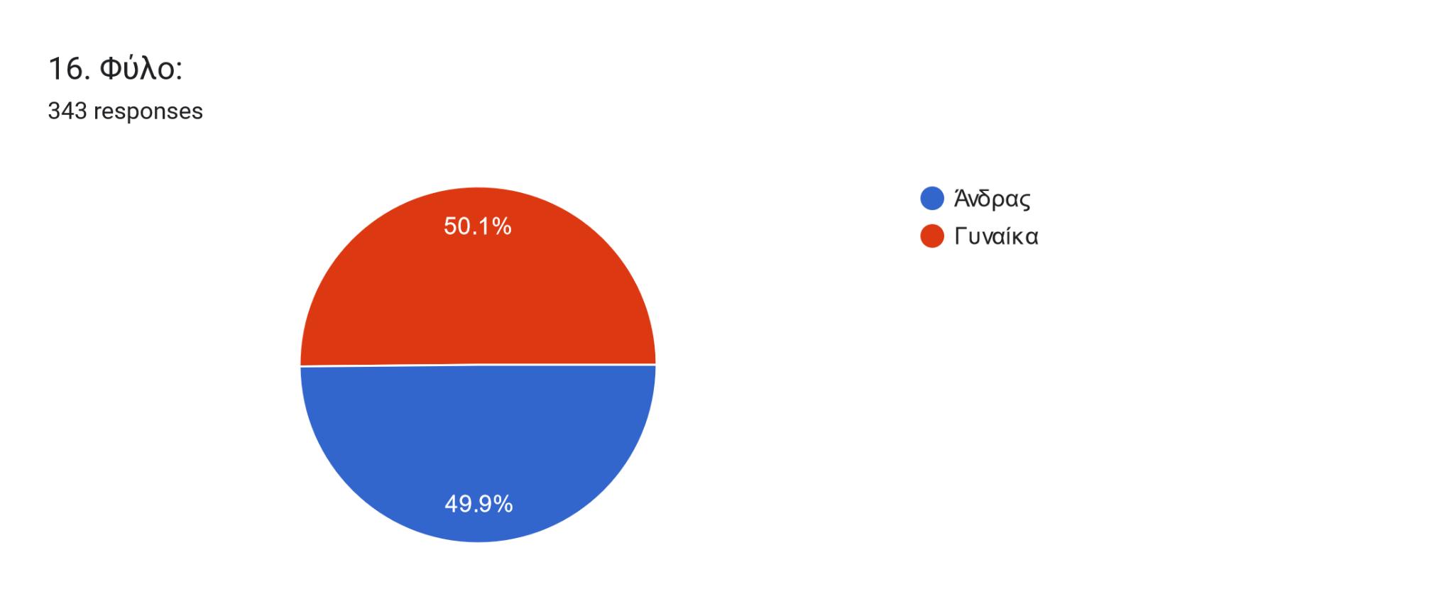 Ερώτηση νο.16 (πηγή: Google Forms) Στο ερώτημα 16 “Φύλο:” απάντησαν 343 άτομα. 172 (50.1%) απάντησαν “Γυναίκα” και 171 (49.9%) “Άνδρας”.