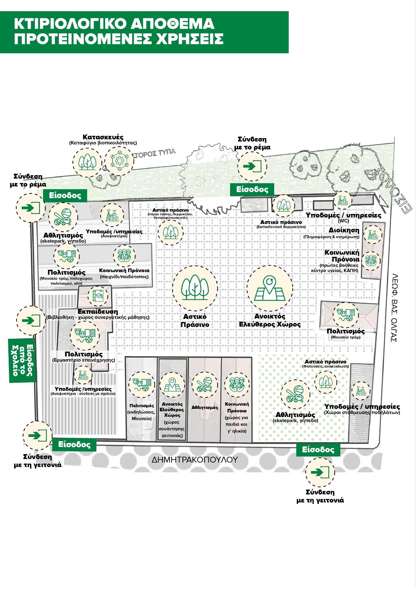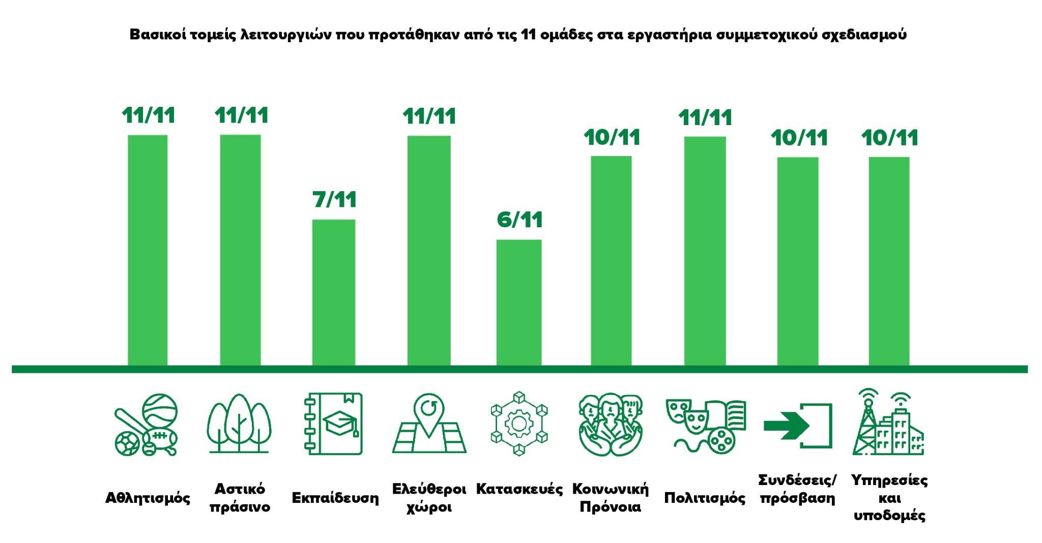 του υπάρχοντος κτιριακού αποθέματος για τη φιλοξενία αθλητικών δραστηριοτήτων και σε άλλες η δημιουργία νέων υποδομών (skate park, γήπεδο μπάσκετ, αθλητικό πάρκο κ λπ ) Σημαντικό είναι ότι ο αθλητισμός, σε συνδυασμό με τη ψυχαγωγία και την κοινωνικοποίηση, ήταν βασικές ανάγκες που ζητήθηκαν να ικανοποιηθούν, μέσα από την αξιοποίηση του χώρου, από όλες τις ομάδες της σχολικής κοινότητας -Αστικό πράσινο: Το περιβαλλοντικό στοιχείο είναι ένα ακόμα που ανέδειξε η πλειοψηφία των πολιτών: η ανάγκη για ουσιαστική και ποιοτική ενίσχυση του αστικού πρασίνου στο χώρο ήταν κυρίαρχη σχεδόν σε όλες τις προτάσεις (βοτανικός κήπος, θερμοκήπιο, παρκο τσέπης, δενδροφυτεύσεις κτλ ) Η ανάγκη για χώρους πρασίνου ήταν άμεσα συνδεδεμένη, σχεδόν σε όλες τις ομάδες, με την σωματική και ψυχική