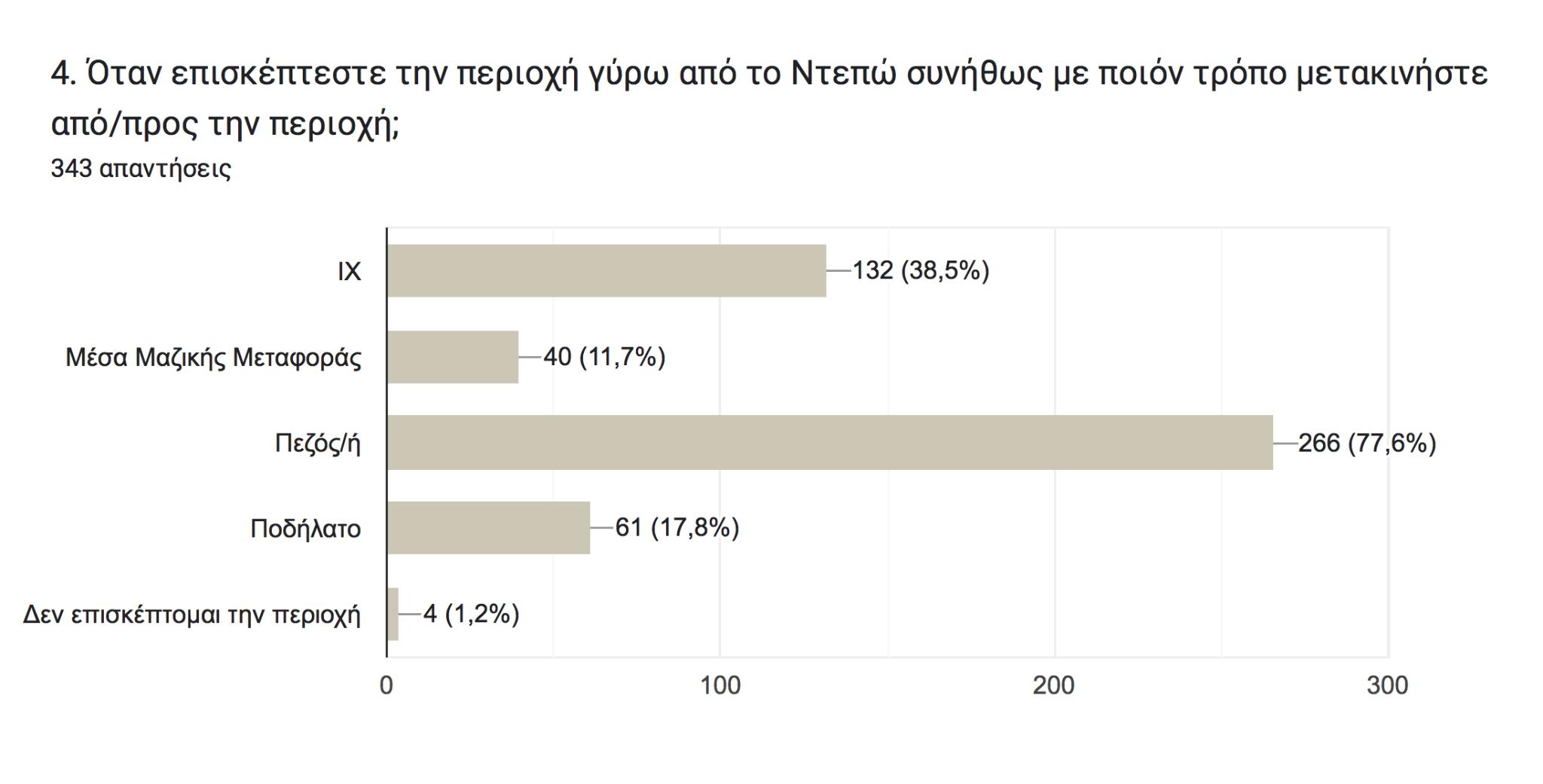 Στο ερώτημα 4 “ Όταν επισκέπτεστε την περιοχή γύρω από το Ντεπώ συνήθως με ποιόν τρόπο μετακινήστε από/προς την περιοχή;” απάντησαν 343 άτομα Το 77,6% απάντησε ότι επισκέπτεται την περιοχή “Πεζός/ή”, το 38,5% με το ΙΧ, 17,8% με το ποδήλατο, 11,7% με τα “Μέσα Μαζικής Μεταφοράς”, ενώ μόλις το 1,2% απάντησε ότι δεν επισκέπτεται την περιοχή Στο ερώτημα 5 “Ποιο θεωρείτε το πιο χαρακτηριστικό γνώρισμά του Παλαιού Αμαξοστασίου (συγκρότημα Ντεπώ);” απάντησαν 204 άτομα. Για την καλύτερη ανάγνωση των αποτελεσμάτων, οι απαντήσεις διακρίθηκαν σε 5 κατηγορίες. Συγκεκριμένα 75 άτομα ανέδειξαν την “Αρχιτεκτονική” ως πρώτο χαρακτηριστικό γνώρισμα, 31 άτομα απάντησαν η “Ιστορικότητα”, 29 άτομα την αξία του ως “Τοπόσημο”, 28 άτομα την “Υποβάθμιση”, 12 άτομα σημείωσαν την “Περιβαλλοντική Αξία”, 11 άτομα την “Προοπτική”, 2 άτομα δήλωσαν “Αδιαφορία”, ενώ μόλις 1 άτομο