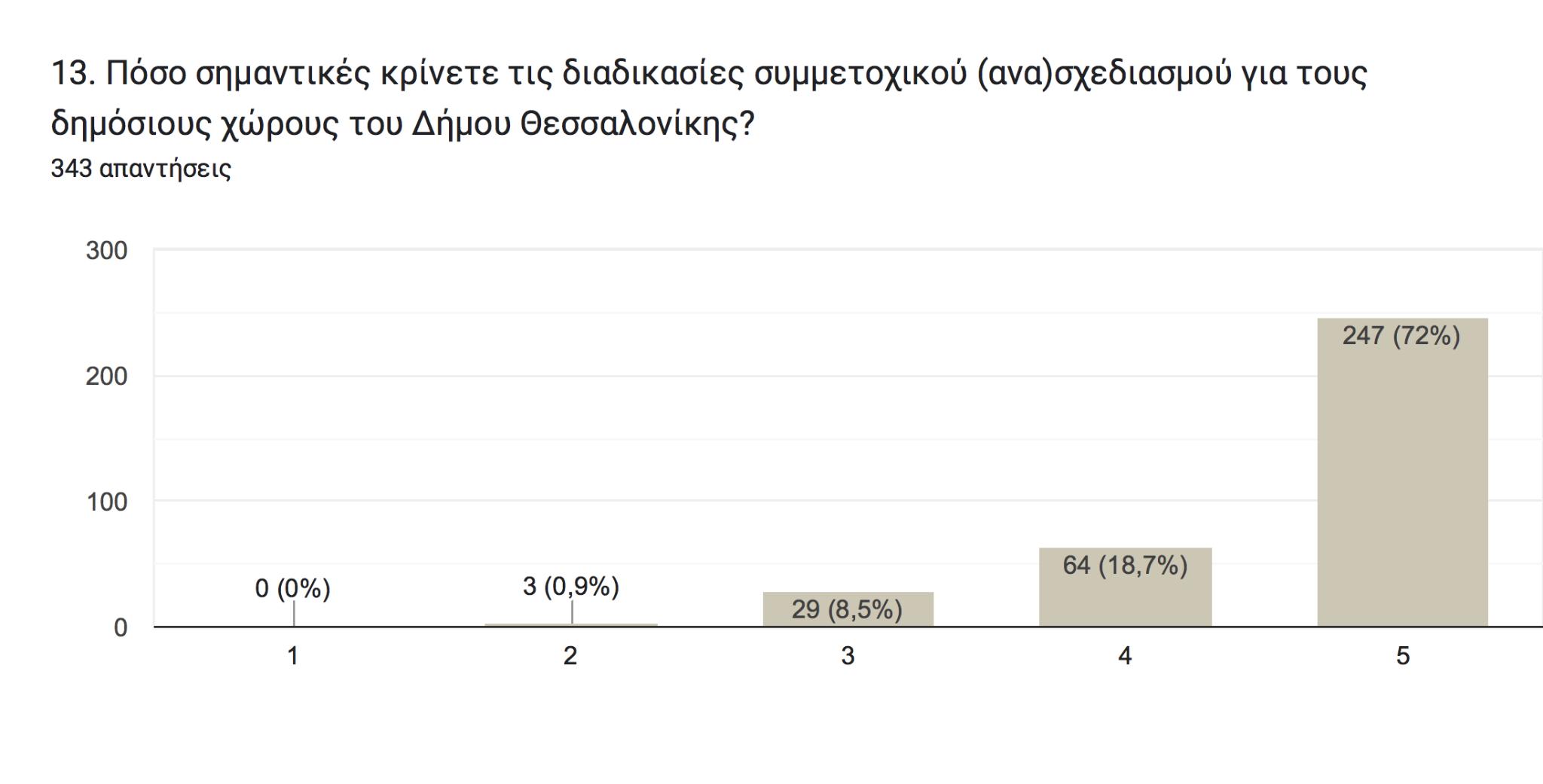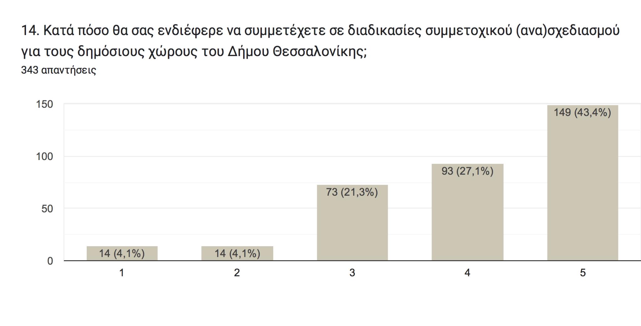 (πηγή: Google Forms) Στην ερώτηση 13 “Πόσο σημαντικές κρίνετε τις διαδικασίες συμμετοχικού (ανα)σχεδιασμού για τους δημόσιους χώρους του Δήμου Θεσσαλονίκης” απάντησαν 343 άτομα. “Πολύ σημαντικό” απάντησε το 72%, “Σημαντικό” απάντησε το 18,7%, “Ουδέτερα” απάντησε το 8,5%, “Λίγο Σημαντικό” απάντησε το 0,9% και κανένα άτομο απάντησε “Καθόλου σημαντικό” Ερώτηση νο14 (πηγή: Google Forms) Στην ερώτηση 14 “Κατά πόσο θα σας ενδιέφερε να