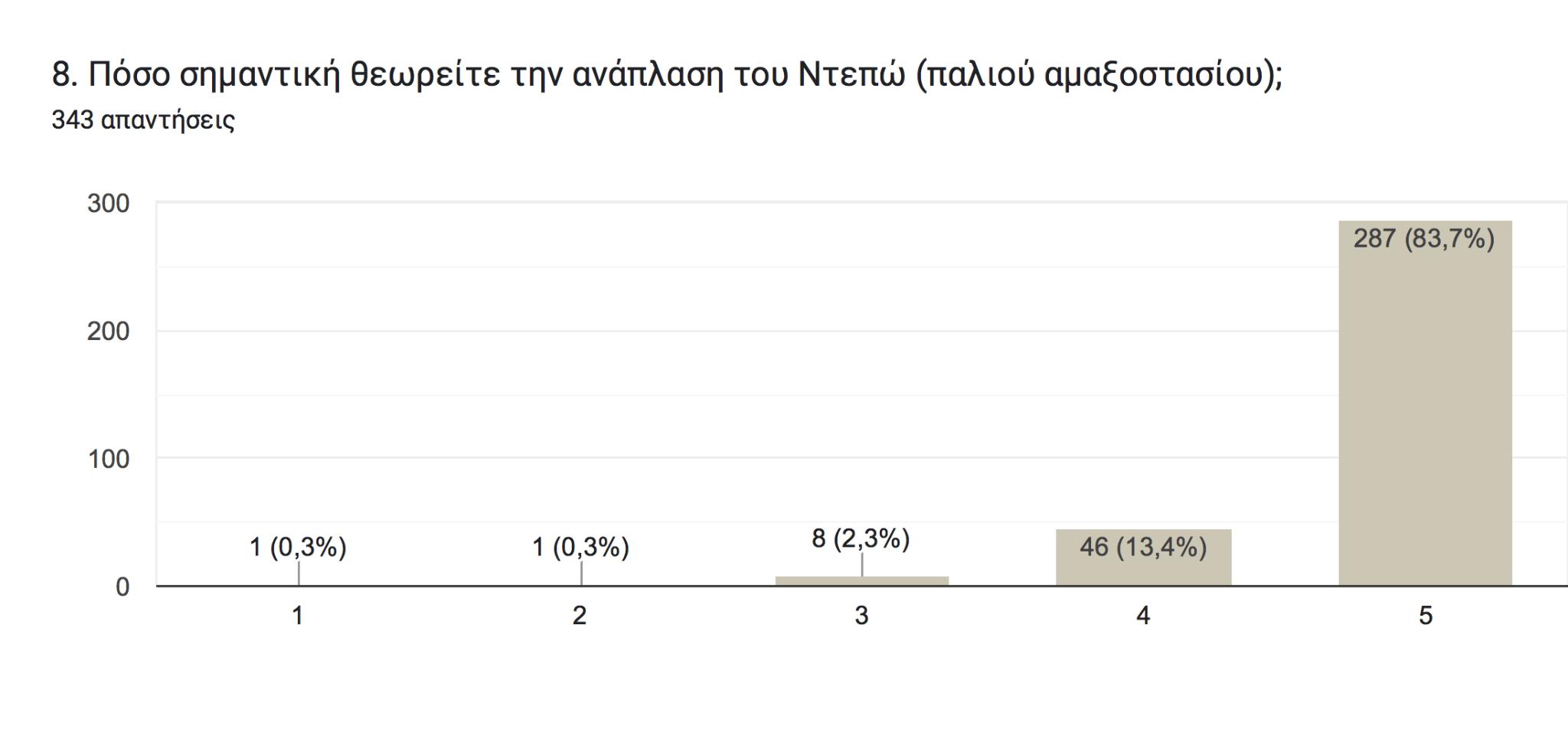 Ερώτηση νο 8 (πηγή: Google Forms) Στο ερώτημα 8 “Πόσο σημαντική θεωρείτε την ανάπλαση του Ντεπώ (παλιού αμαξοστασίου)” απάντησαν 343 άτομα “Πολύ σημαντική” θεωρήθηκε από 287 άτομα, “Σημαντική” από 46, “Ουδέτερο” απάντησαν 8 άτομα, “Λίγο σημαντική” απάντησε 1 άτομο και “Καθόλου σημαντική” απάντησε 1 άτομο