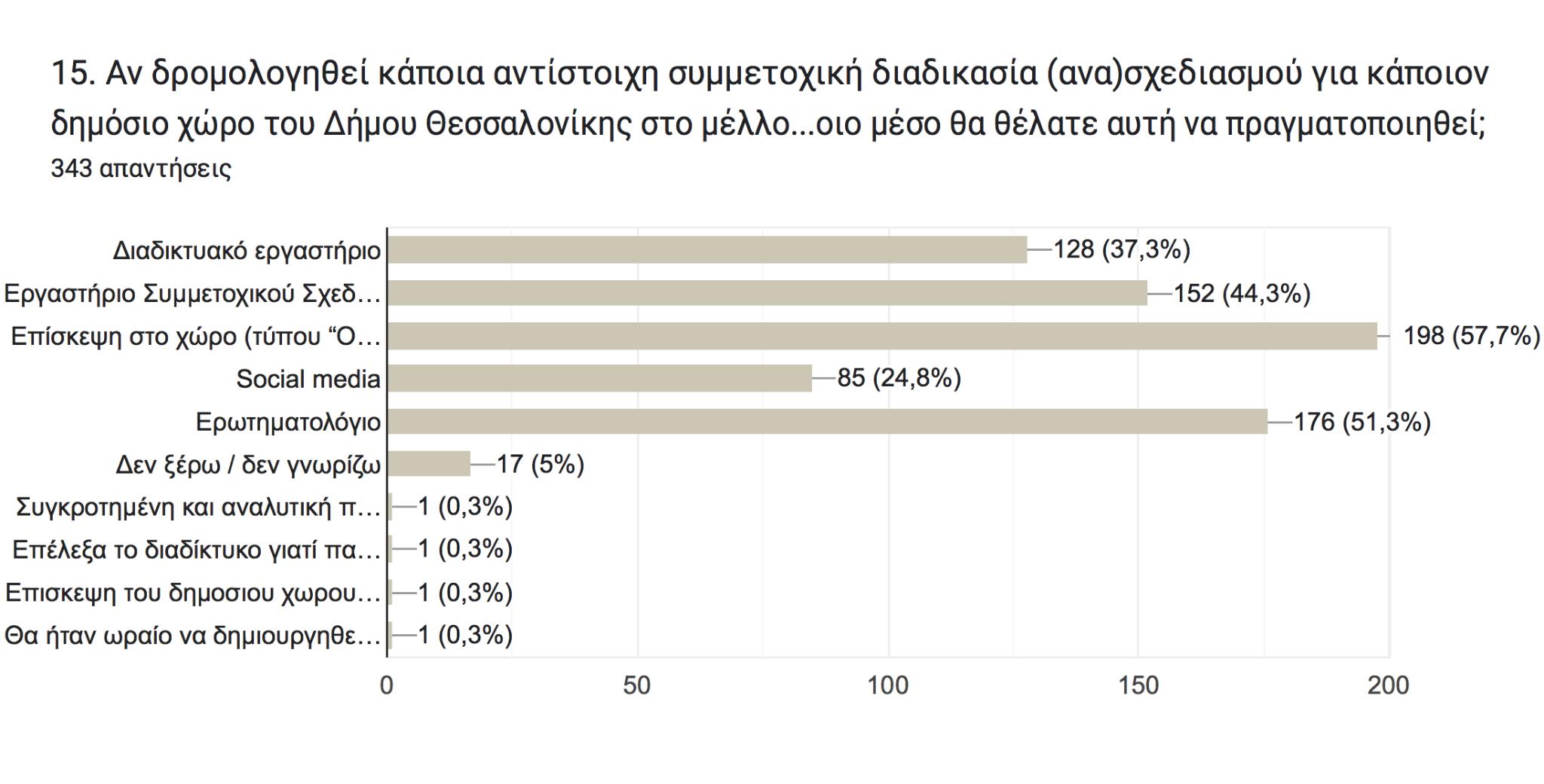Στην ερώτηση 15 “Αν δρομολογηθεί κάποια αντίστοιχη συμμετοχική διαδικασία (ανα)σχεδιασμού για κάποιον δημόσιο χώρο του Δήμου Θεσσαλονίκης στο μέλλον, με ποιο μέσο θα θέλατε αυτή να πραγματοποιηθεί” απάντησαν 343 άτομα. “Επίσκεψη στο χώρο (τύπου Open House)” απάντησαν 198 άτομα, “Εργαστήριο Συμμετοχικού Σχεδιασμού” απάντησε το 152 άτομα, “Διαδικτυακό εργαστήριο” απάντησαν 128 άτομα, “Ερωτηματολόγιο” απάντησαν 176 άτομα, “Social Media” απάντησαν 85 άτομα, “Δεν ξέρω/ δεν γνωρίζω” απάντησαν 85 άτομα και υπήρξαν 4 απαντήσεις εκτός πλαισίου