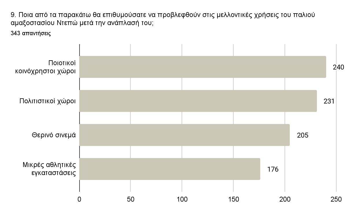 όσο και στις αντίστοιχες για τη βιωσιμότητα του αναπλασμένου χώρου Παρότι ο πλούτος και η ζωντάνια των επιμέρους προτάσεων αξιοποίησης του Ντεπώ, όπως προέκυψαν από την έρευνα του ερωτηματολογίου και τα δύο εργαστήρια του συμμετοχικού σχεδιασμού, δεν αντικαθίσταται από ευσύνοπτες προτάσεις-λύσεις, η ανάγκη για μια συνοπτική αποτύπωσή τους οδηγεί στα παρακάτω συμπεράσματα: Γενικά συμπεράσματα από τη διαδικτυακή έρευνα: -Η συμμετοχή των πολιτών στη διαδικτυακή έρευνα ήταν υψηλή και μέσα από αυτή επιβεβαιώθηκε το ενδιαφέρον τους για την περιοχή του Ντεπώ και το αίτημα τους για άμεση αξιοποίηση του χώρου -Κυρίαρχες προτάσεις των πολιτών για την αξιοποίηση της περιοχής (με σειρά προτίμησης) είναι: οι ποιοτικοί κοινόχρηστοι χώροι, οι πολιτιστικοί χώροι, το θερινό σινεμά οι μικρές αθλητικές εγκαταστάσεις. -Σημαντικό αναδείχθηκε “ο Δήμος να συνεργαστεί με ιδιωτικούς φορείς φορείς προκειμένου να εξασφαλίσει τη βιωσιμότητα του