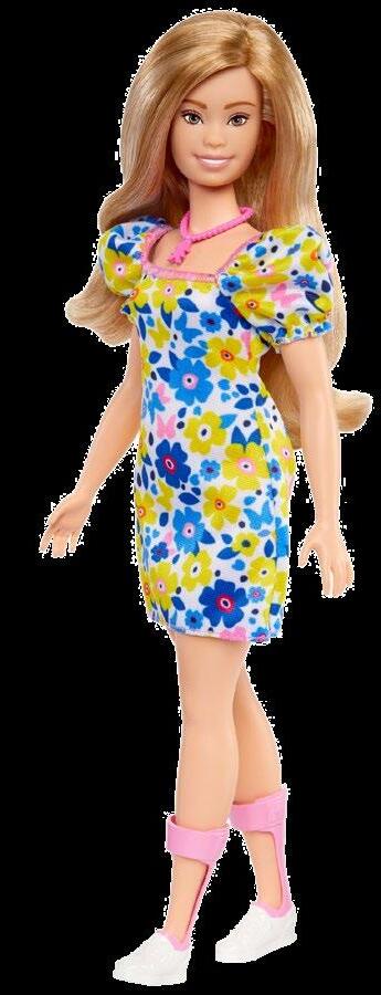 • Orthotics: Barbie wears pink ankle foot orthotics (AFOs) to match her outfit, and her sneakers feature a zipper detail. Some children with Down syndrome use orthotics to support their feet and ankles.