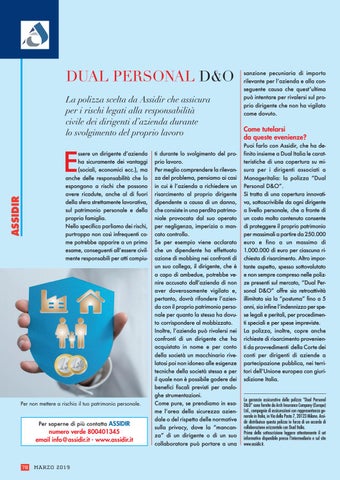ssere un dirigente d’azienda ha sicuramente dei vantaggi (sociali, economici ecc.), ma anche delle responsabilità che lo espongono a rischi che possono avere ricadute, anche al di fuori della sfera strettamente lavorativa, sul patrimonio personale e della propria famiglia. Nello specifico parliamo dei rischi, purtroppo non così infrequenti come potrebbe apparire a un primo esame, conseguenti all’essere civilmente responsabili per atti compiu-