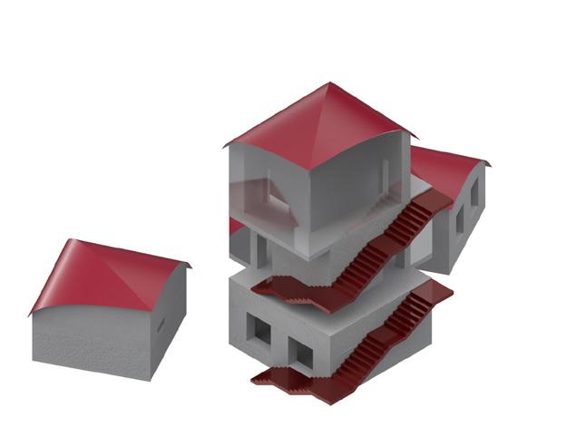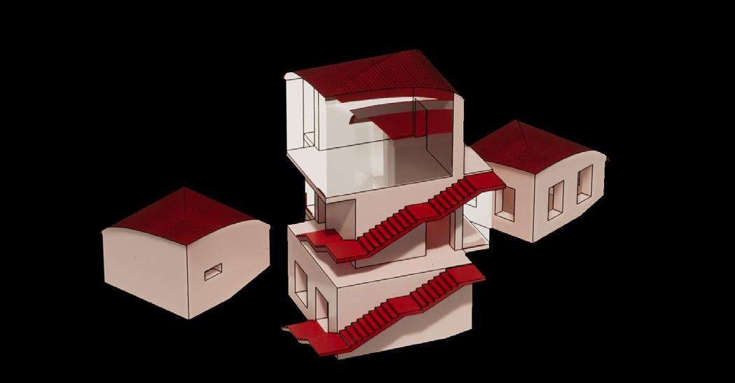 The information center mimics the existing olive oil mill in material use and creates a contrast with its modern form. The stacked volumes of the center allow varying degrees of visual connection owing to the alternating stone and glass facades. The roofing is inspired by the vernacular architecture of the region, whereas its towering structure, as compared to the surrounding context establishes it as an entry point into the town. The information center follows the same language as the rest of the interventions, with its circulation, marked distinctively, allowing it to fit into the whole narrative.