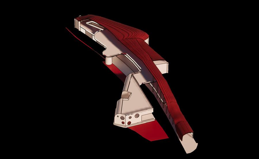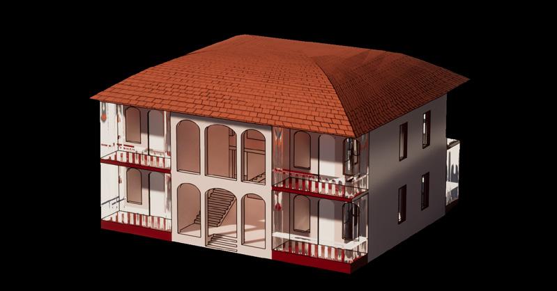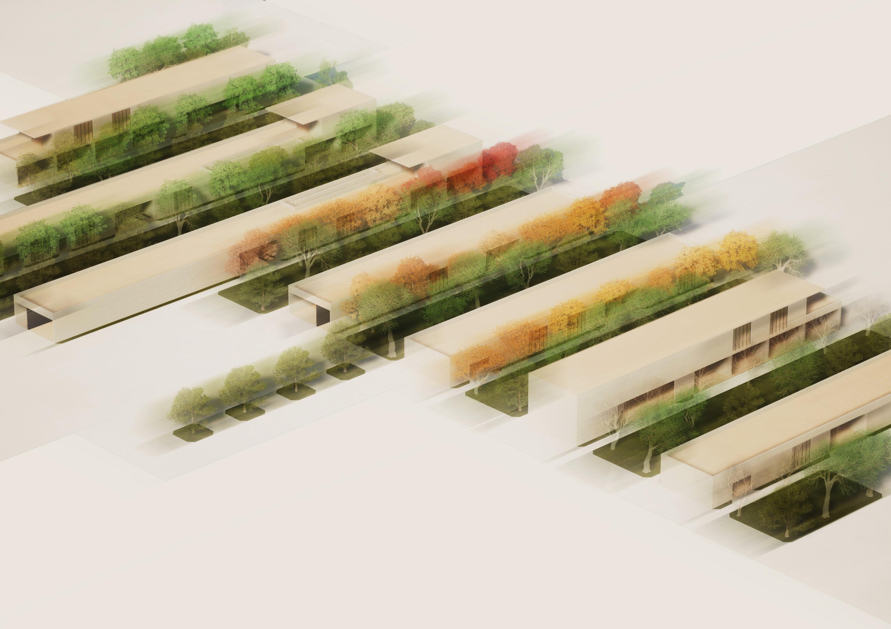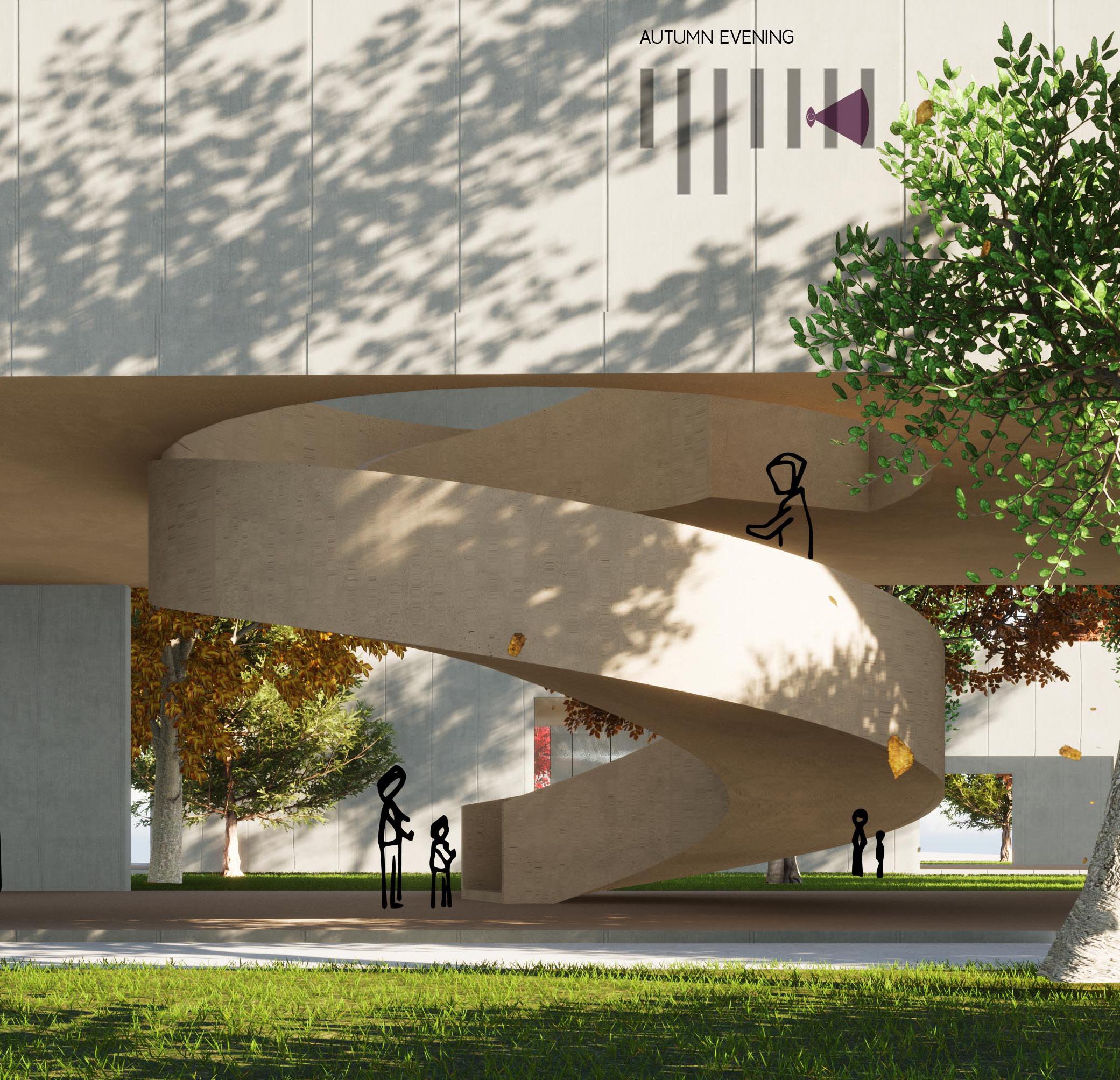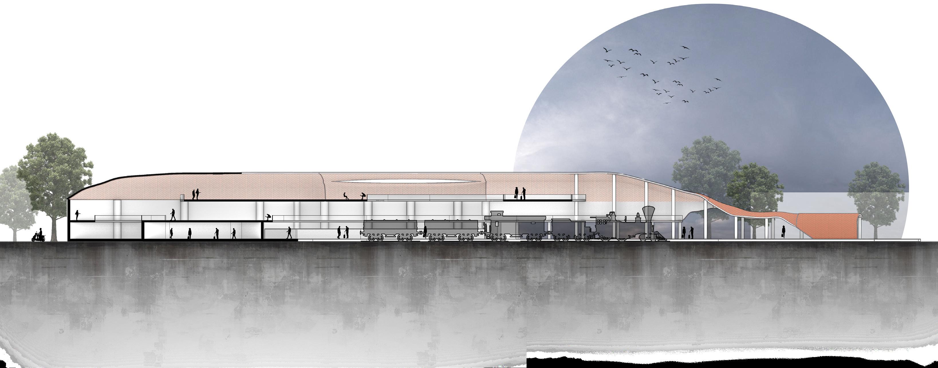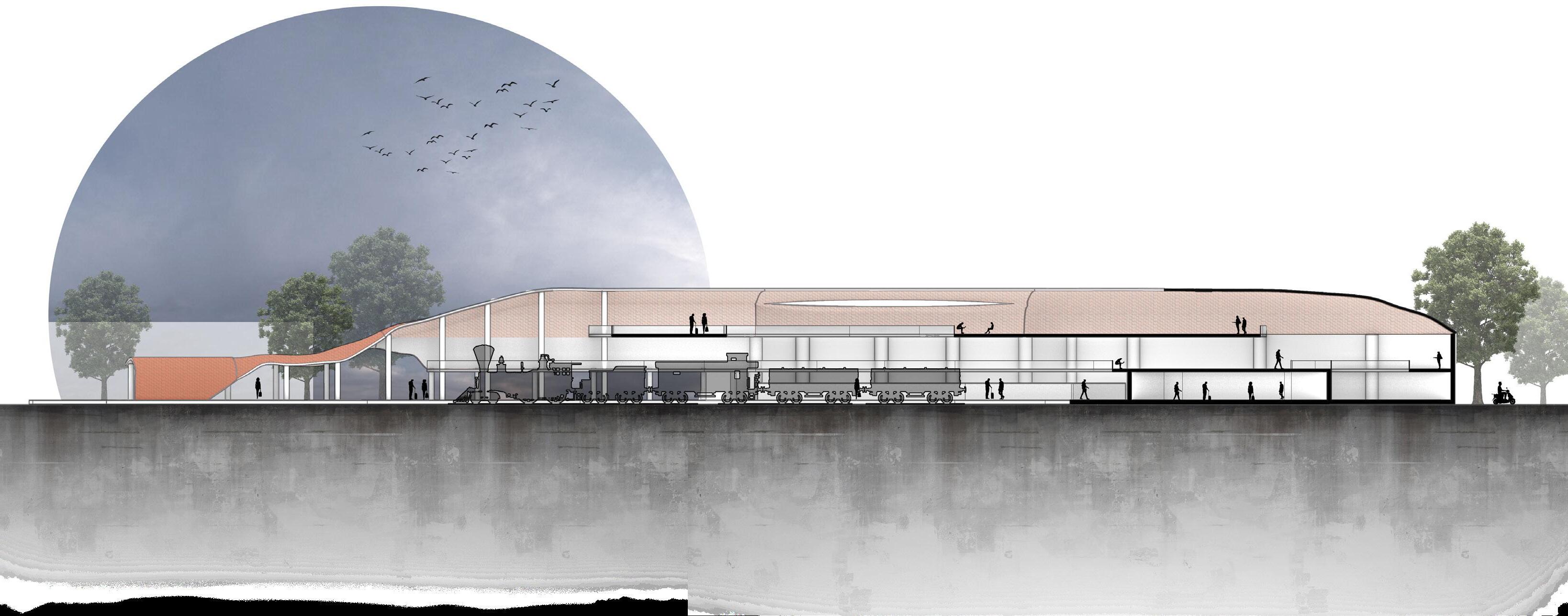 Designed as the focal point of the whole intervention, the museum and art school in the railway park create a strong contrast against neighboring buildings owing to their fluid form. Especially the roof of the structure, constructed using local materials like brick tiles, adds a dynamic element to the whole structure as a subtle nod to the forever-inmotion nature of the railways. Additionally, the design also adopts vernacular architectural elements, reconstructing them with modern material to showcase the passage of time.