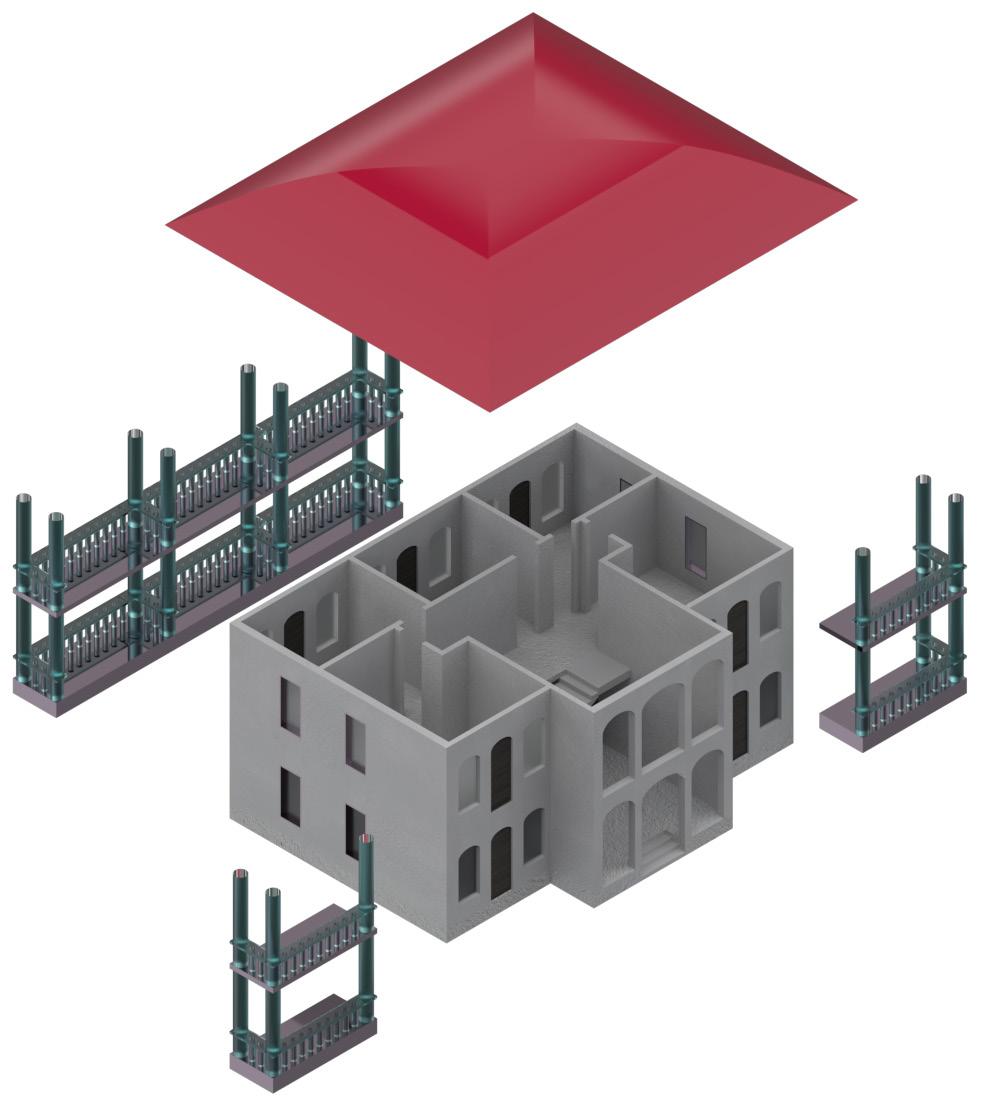 This area marks the entrance to the town of Elini. Since no changes to the former olive oil mill present there were allowed, a tourist information center is provided in a new intervention. The tower, which is essentially a stack of solid, transparent volumes also has viewing decks overlooking the town and its surroundings.