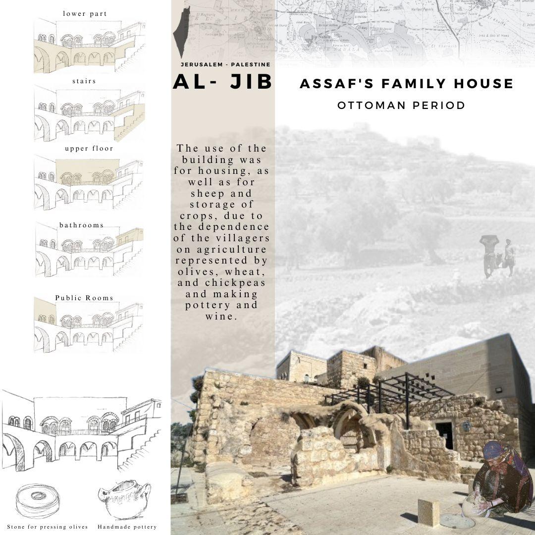 Al-Jib,inthenorthwestofJerusalem,atadistanceoftenkilometresfromit,risingfromsealevelabout710m. ThevillageofAl-Jibdatesbackfrom(3300to3000BC)inthepresentplaceofthevillageanimportantCanaanite villagewasestablishedduringtheBronzeandIronAges(Gibeon),whichmeanshill.Itslandareais8,750dunums. TherearemanyarchaeologicalsitesinthevillageofAl-Jib,suchastheancientwaterpool,theByzantinechurch,oil presses,andancientcaves.Al-JibwasaneconomictradepointduetoitslocationontheroadbetweenJerusalem andRamallah.ThevillagewasameetingplaceforPalestinianmerchantsfromtheWestBank,anditcontributedto theprosperityoftradeinthatarea.Thiseconomicsituationcontinueduntilthefirstyearsofthesecondintifada, butitendedin2006withtheconstructionofTheannexationwallandexpansionthatsurroundedthevillageand isolateditfromoccupiedJerusalem.Inthepicture,thehouseofoneofthevillagefamilies,theAssafFamily,was builtduringtheOttomanperiod.