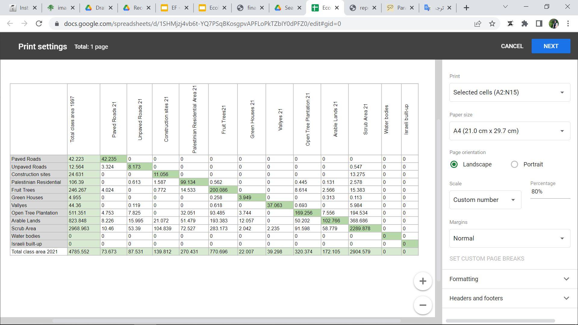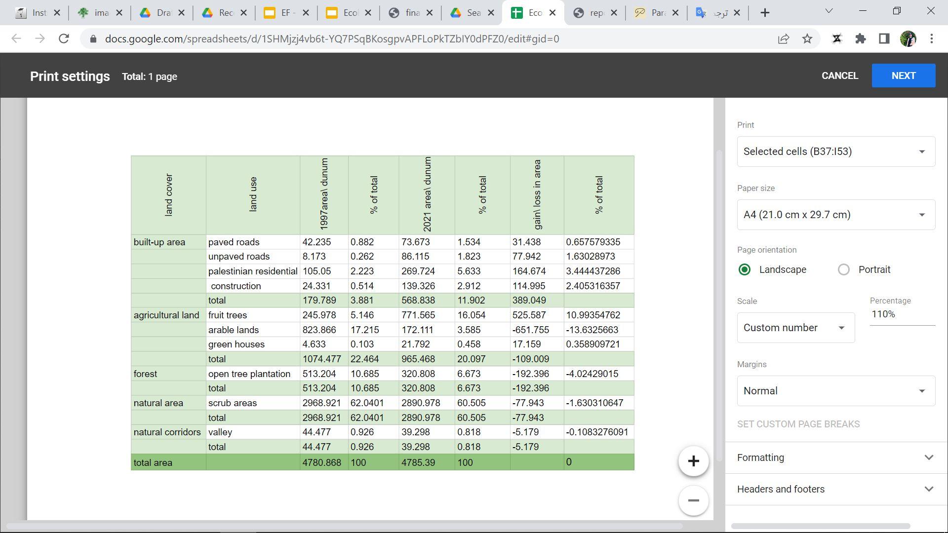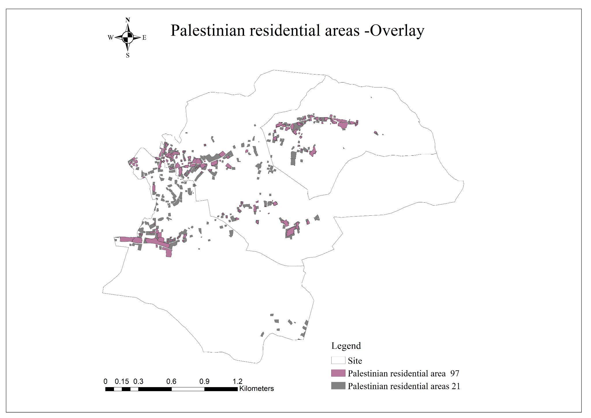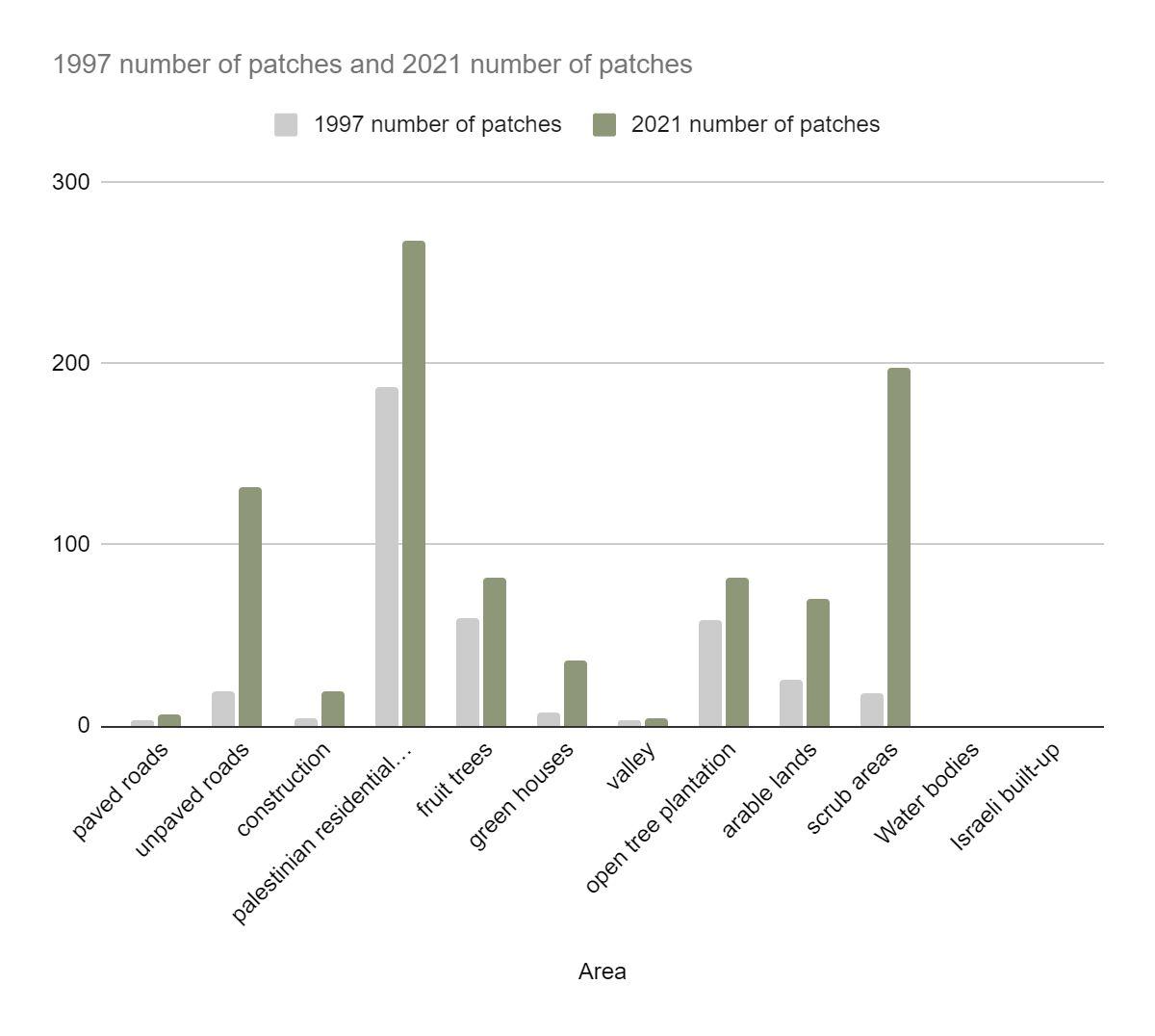 The Palestinian built-up area in 1997 has expanded dramatically from 106.39 donum in 1997 to 270.431 dunum in 2021 ,Most of the increase (gain) from scrub area,arable land, open tree plantation and fruit trees,And the number of patches increased as shown in the table as a result of changing in the use of lands .(see Figure 23,24)