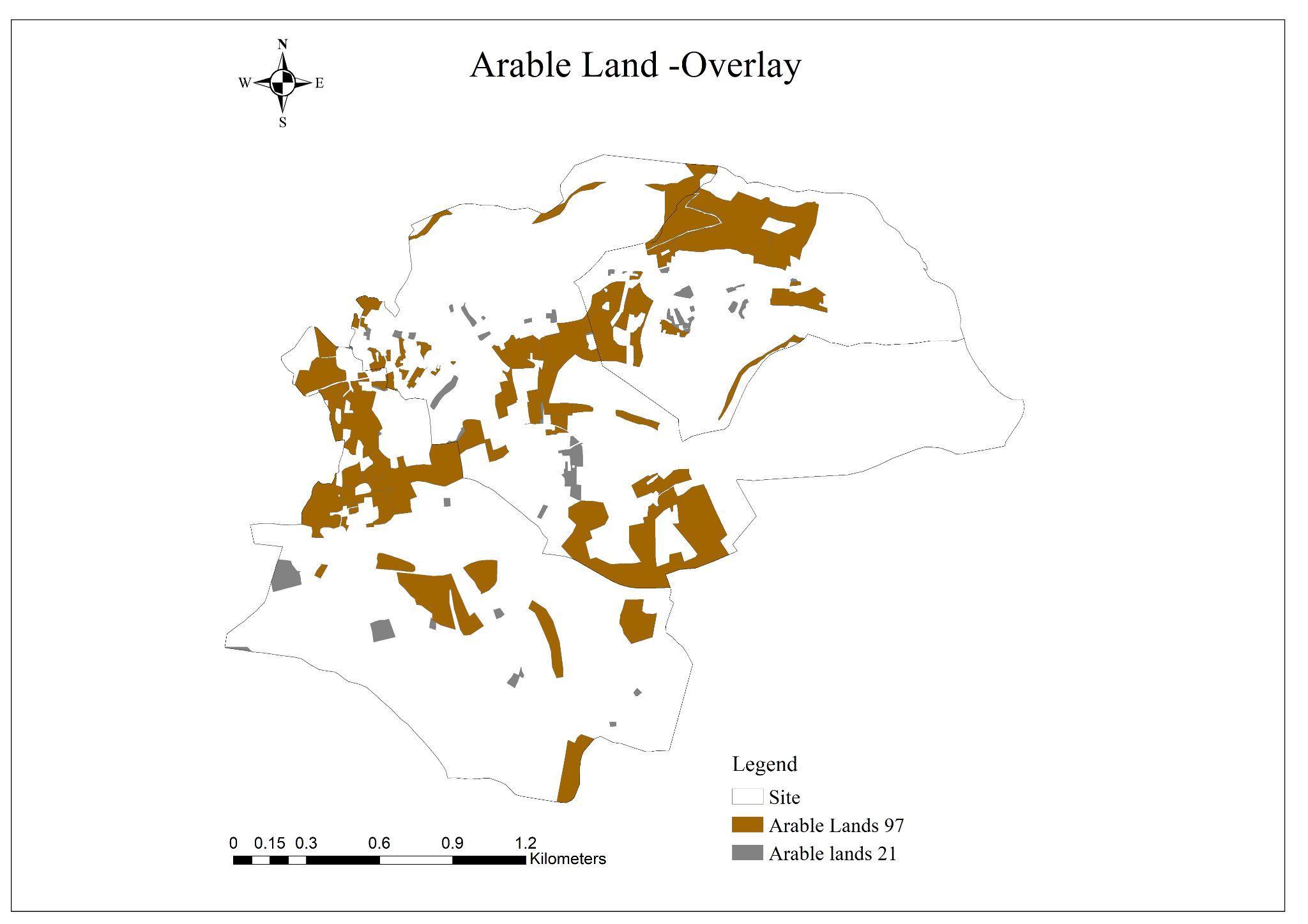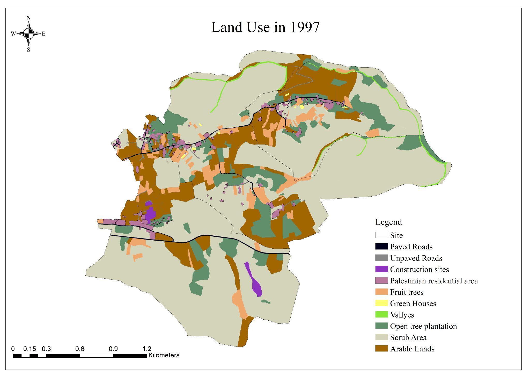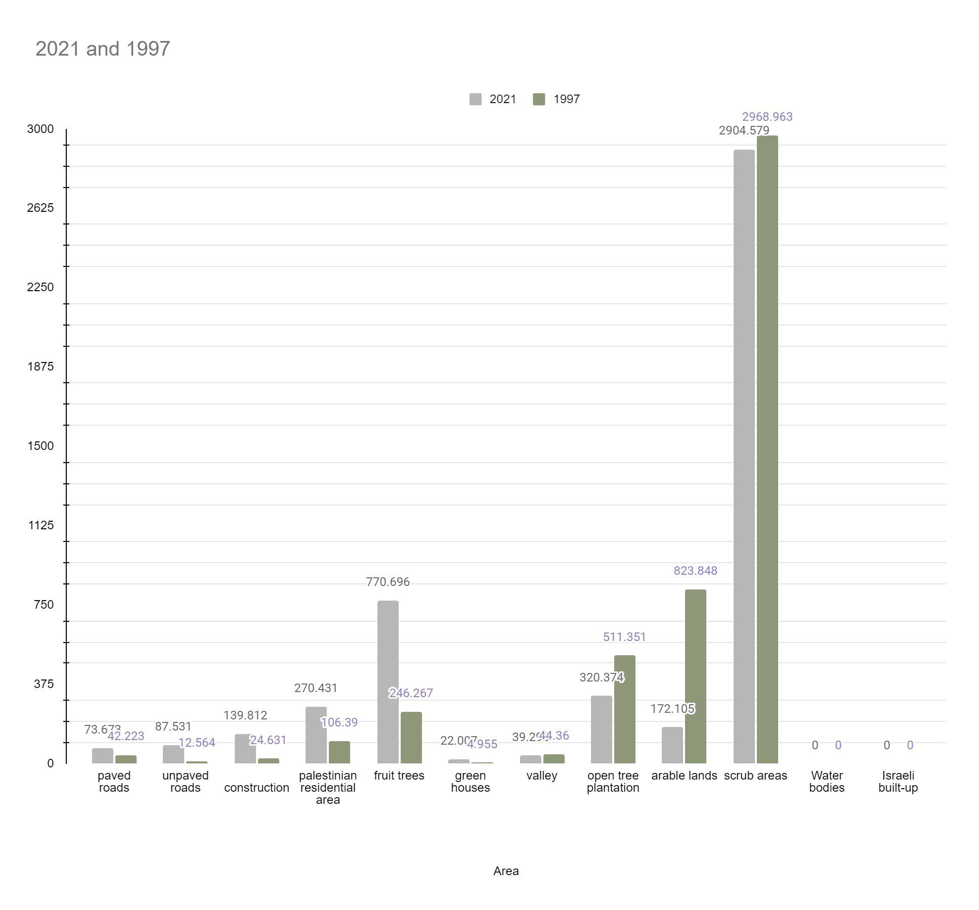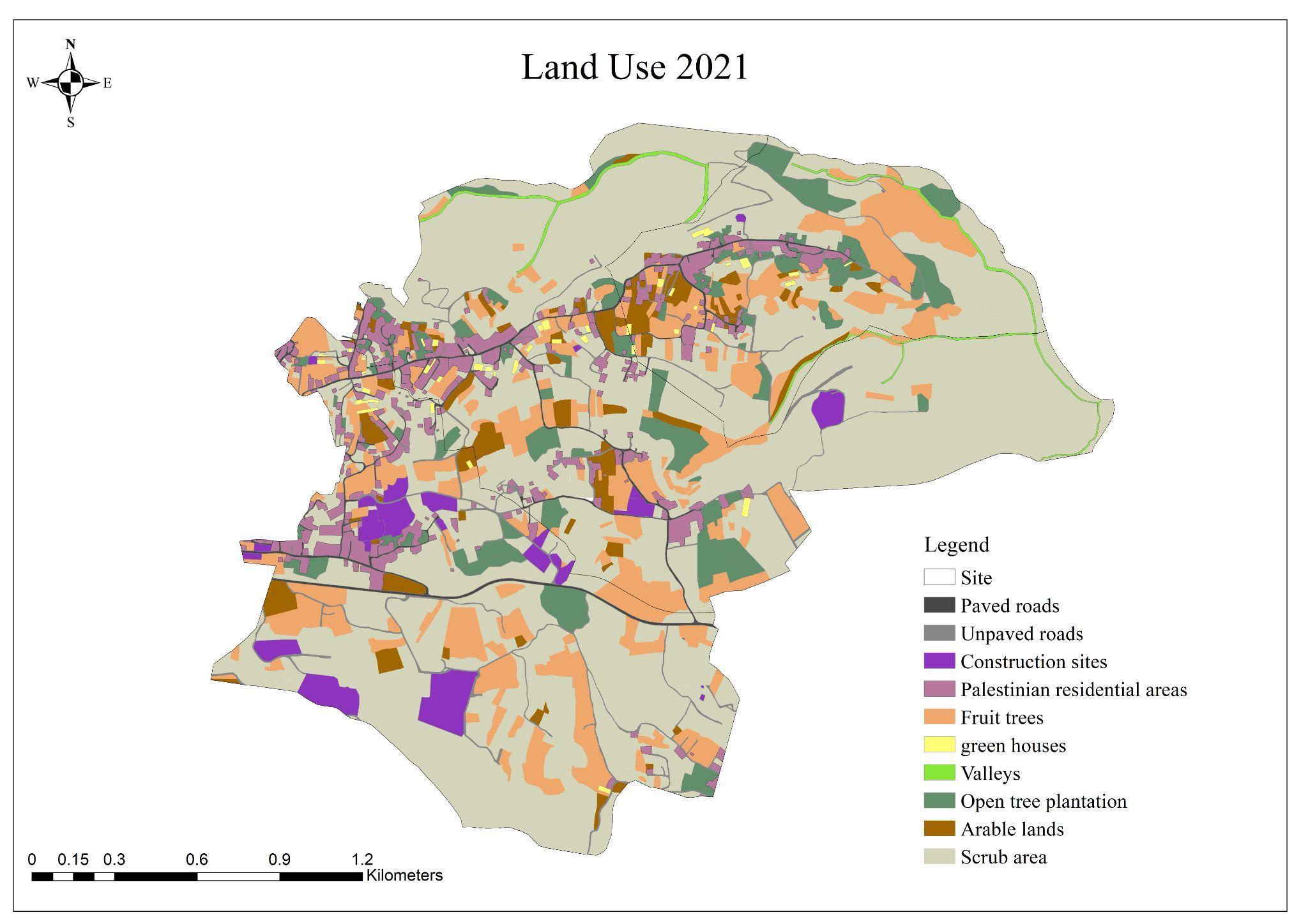 The arable land has decreased from 823.848 donum in 1997 to 172.105 dunum in 2021 the. Most of the decrease (loss) in the arable land has been converted to Palestinian build up areas, paved roads,unpaved roads, arable land, fruit trees, scrub area, construction area and open tree plantation. But it took (gain) from open tree plantation and scrub areas .(see Figure 27,28)