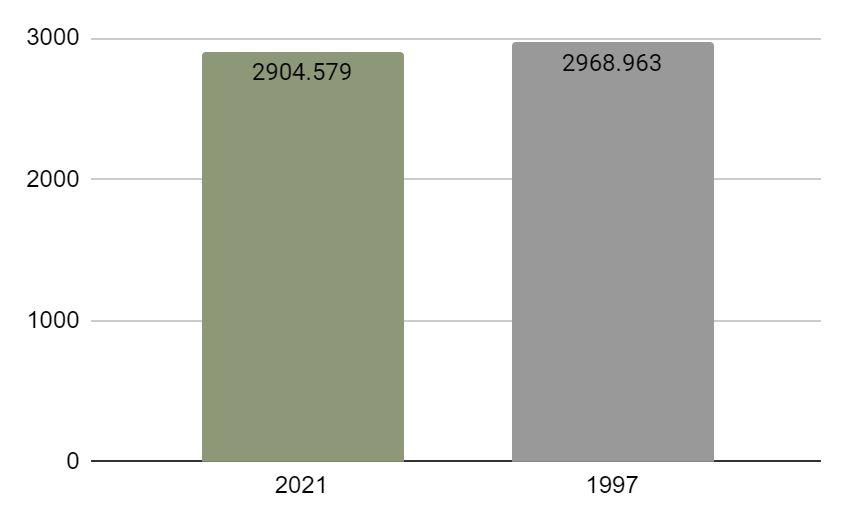 From 2968.963 donum in 1997 to 2904.579 donum in 2021, the scrub area has decreased. The majority of the decrease (loss) in the scrub has been converted into Palestinian construction areas, fruit trees, open tree plantations, and paved and unpaved roads. However, it gained from open tree plantations, arable land, and fruit trees.Despite this decrease, scrub area continues to be considered as the matrix. And the number of patches increased as shown in the table as a result of changing in the use of lands .(see Figure 21,22)