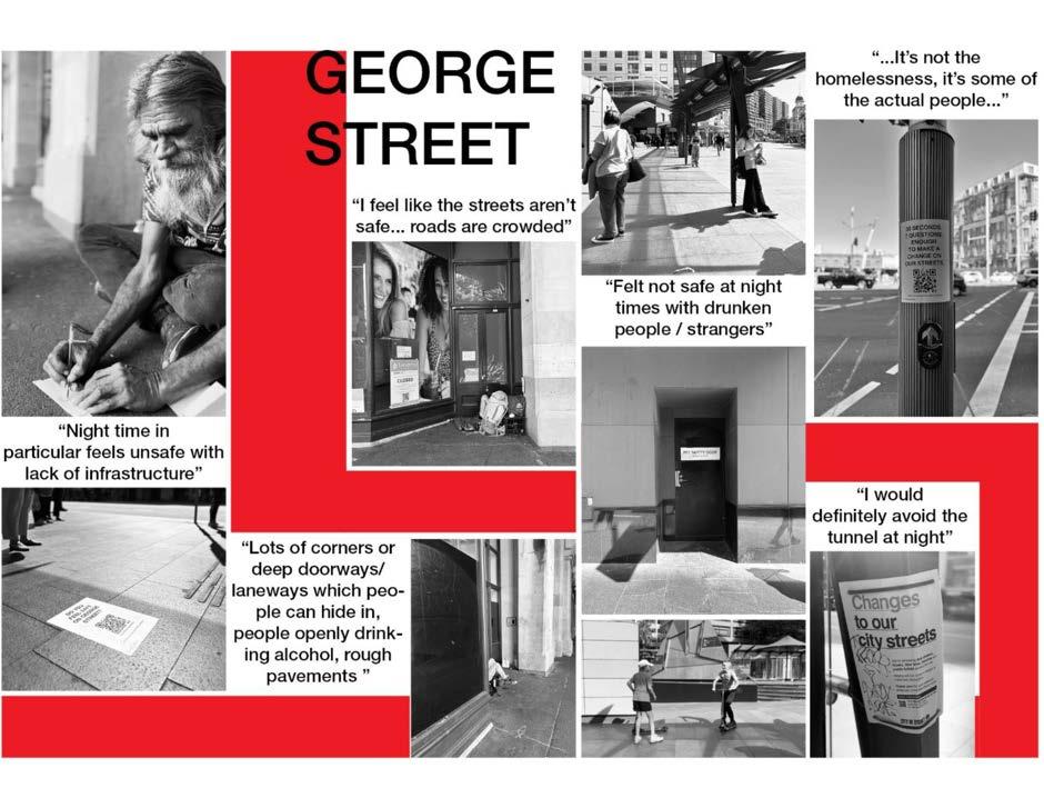 On the City of Sydney website, the council clearly states its intentions for the projects - “The pedestrianisation of George Street all the way to Rawson Place” and “Upgrading local streets…” are the priorities for the local government. The Sydney Streets program aims to increase “... use of footpath and open space for outdoor dining, extended foyer space and live performance.” When stakeholders are involved, they are encouraged to share their thoughts on these specific notions through forums and online interaction. However, what these platforms do not provide is the information that is often unseen, unheard and forgotten - we aim to gather this information and provide it to council, followed by engaging in stakeholder meetings and presenting our findings. We hope our findings allow the council to recognise that they need to resolve the root of these social issues.