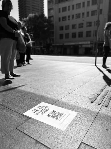 Our methodology is based on finding data which would otherwise be hidden from the local council. Through surveying and simply having conversations with different stakeholders, we question the hostility, safety and accessibility of our streets. Analysing George Street, we use a range of tools to gather data including photography, interviews, surveying and simply observing the behaviours of pedestrians. We then aim to formalise this data into a publication which is presented to the council as a supplementary tool to aid with the redesigning of our streets. Our short-term plan over the next five years is to analyse different parts of the City of Sydney and provide this alternate set of information to council. We will continue our engagement with the council by attending stakeholder meetings and assuring that our unorthodox data is not only considered but also implemented in the transformation of the streets.