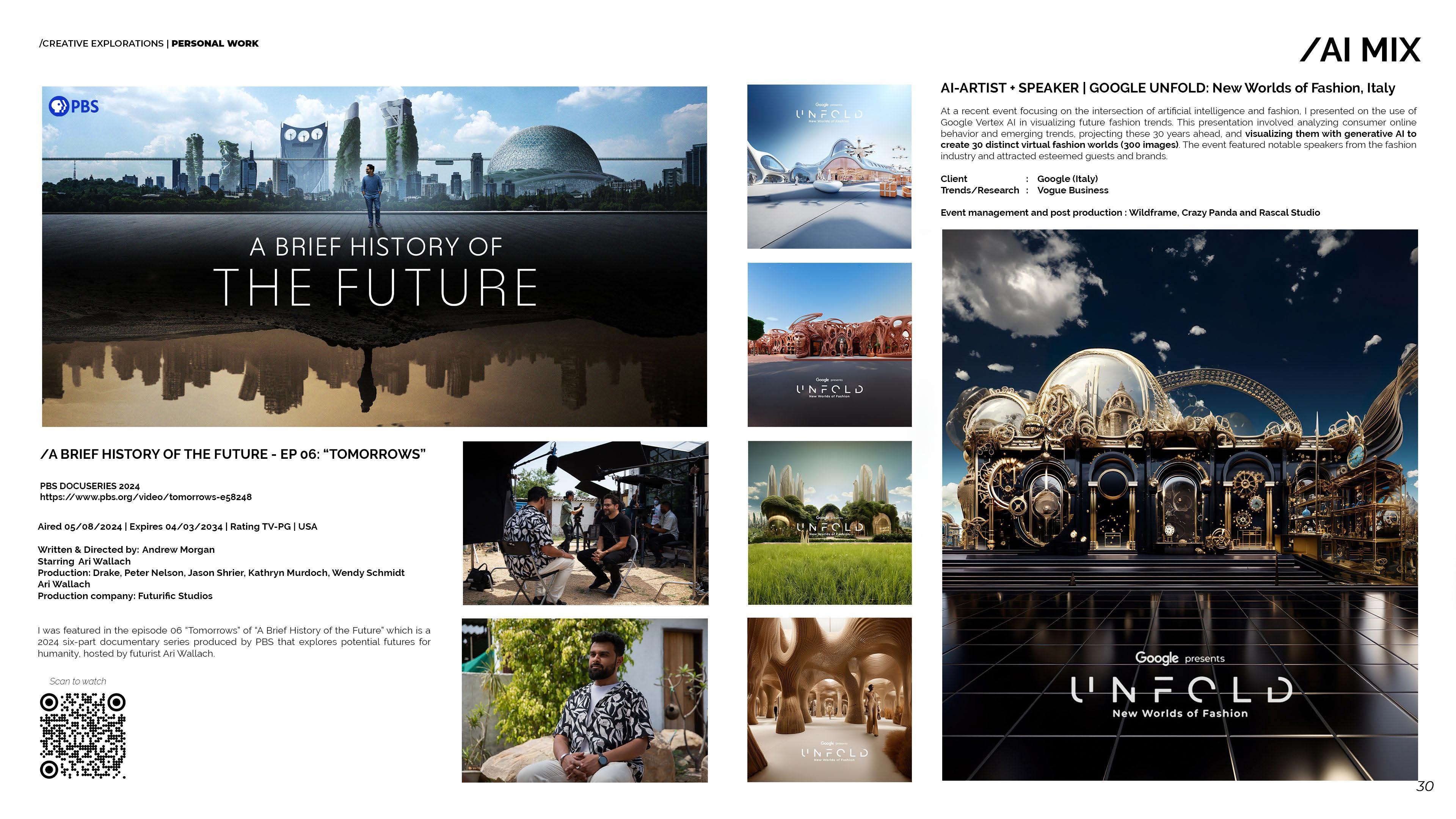 Google UNFOLD: New Worlds of Fashion, Milan, Italy Spoke on the potential of Al in fashion design, Commissionedto createandshowcased300 visuals forthe eventusingAl tools. (2023)