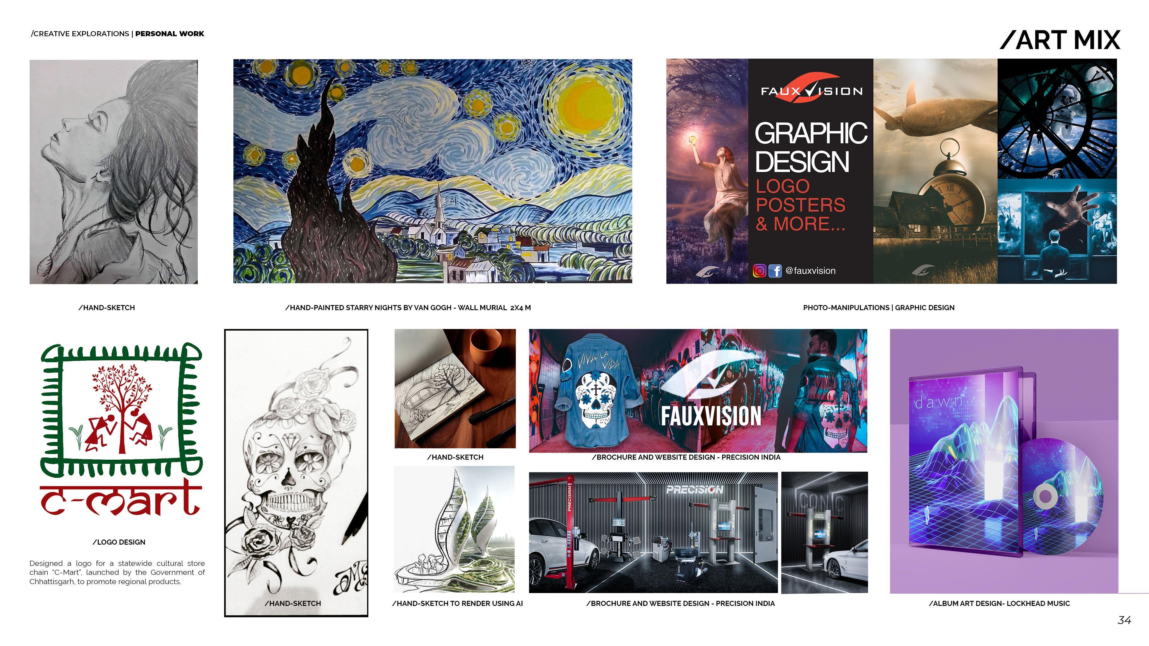 Designedthe logo forC-Mart,a statewide culturalstorechaininitiativebytheGovernmentofChhattisgarh, India. Createdbrandingandgraphicassetsforavehiclewheelalignmentcompany.Developedarchitectural visualizations and high-qualityrendersforindividualclients. Produced advancedphoto-manipulationanddigital artwork forvariousprojects.