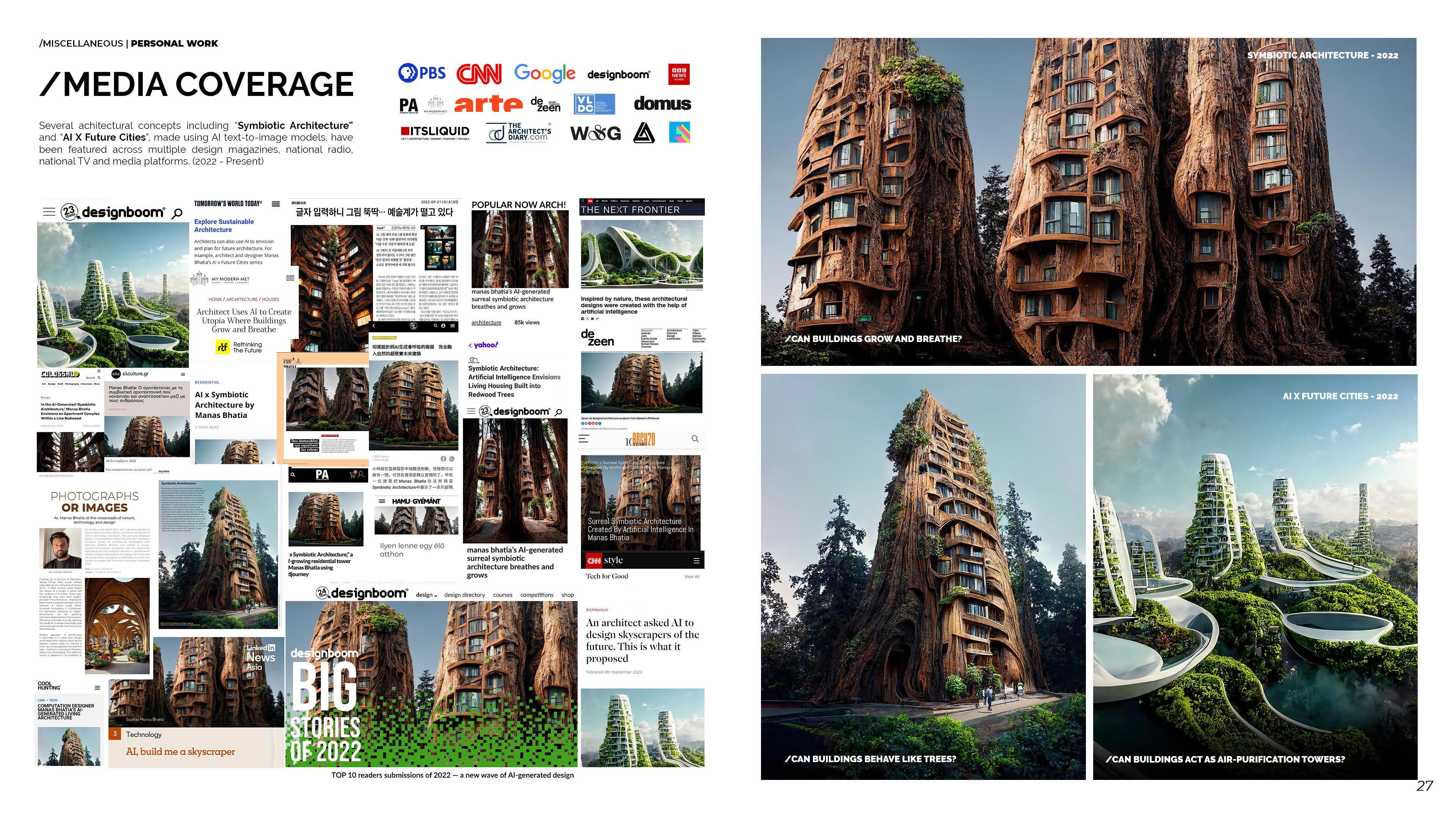Featured in CNN, BBC, Designboom, Dezeen, Parametric Architecture, Colossal, MyModernMet. The Redbulletin, Re-thinking the Future, K-MAG, DNA India, Indian Herald, Yahoo news, Linkedln News, Amazing Architecture, Hospitality Design, Yuzu, t3n, 324CAT, HAUS, DesignMate, CoolHunting, Arch20, Archello, Demilked, Chosun Daily, Epsiloon,Architectureand Design