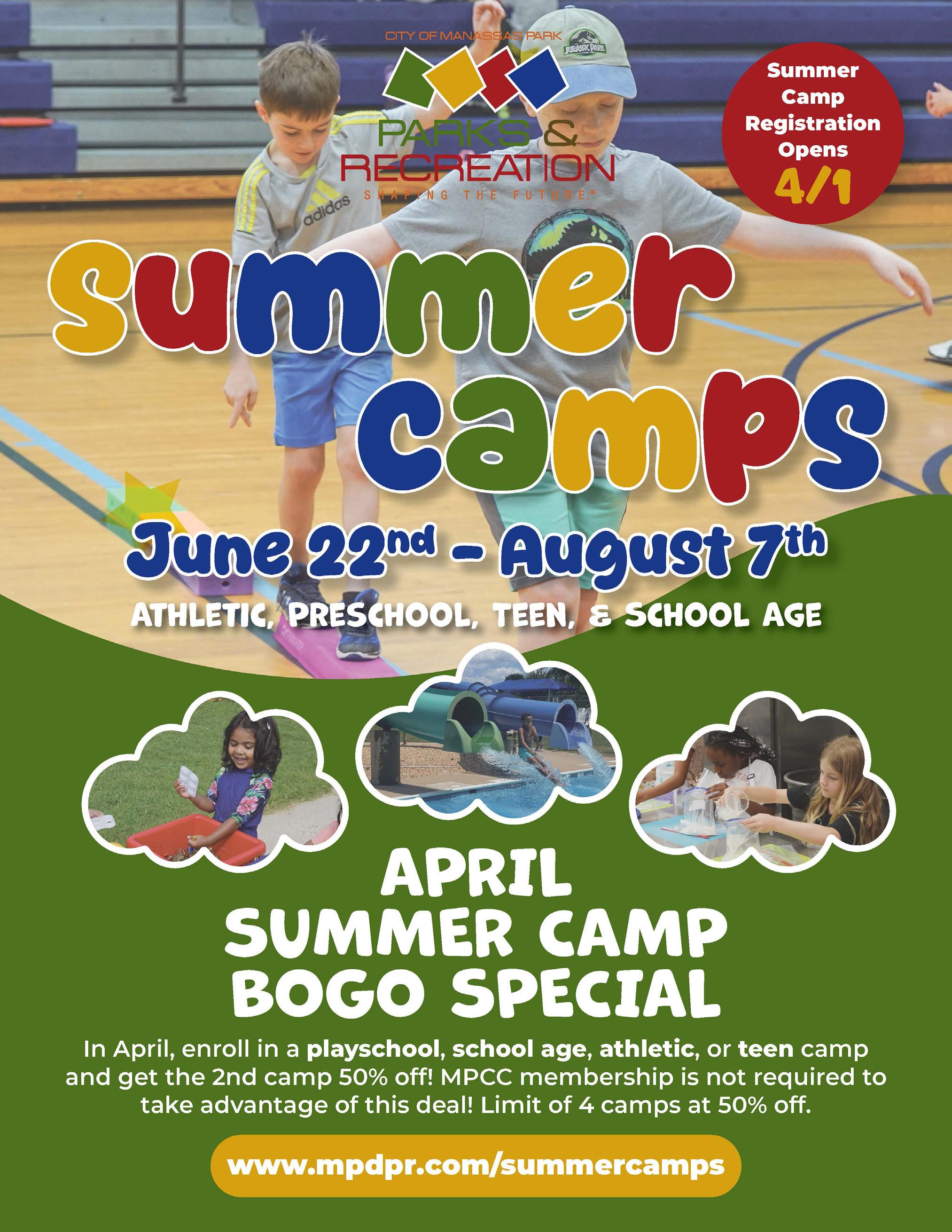 (Rising 1st-6th graders) There is no better place to be than at the Manassas Park Community Center for your summer camp needs. An array of themes, sports, and fun activities provide campers with exciting, fun memory-making moments. Campers will swim once a week on their camp’s designated swim day. Participants MUST sign up by the Monday prior to each camp for camps and camp care.