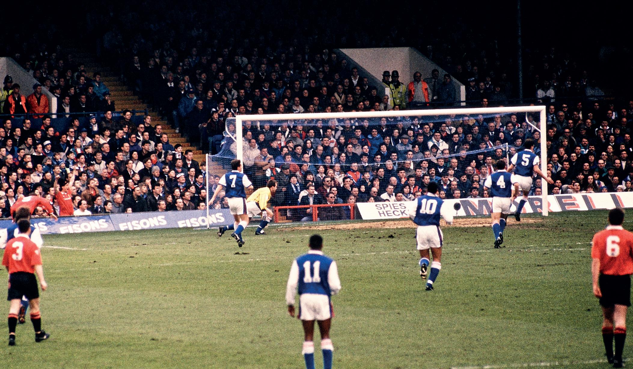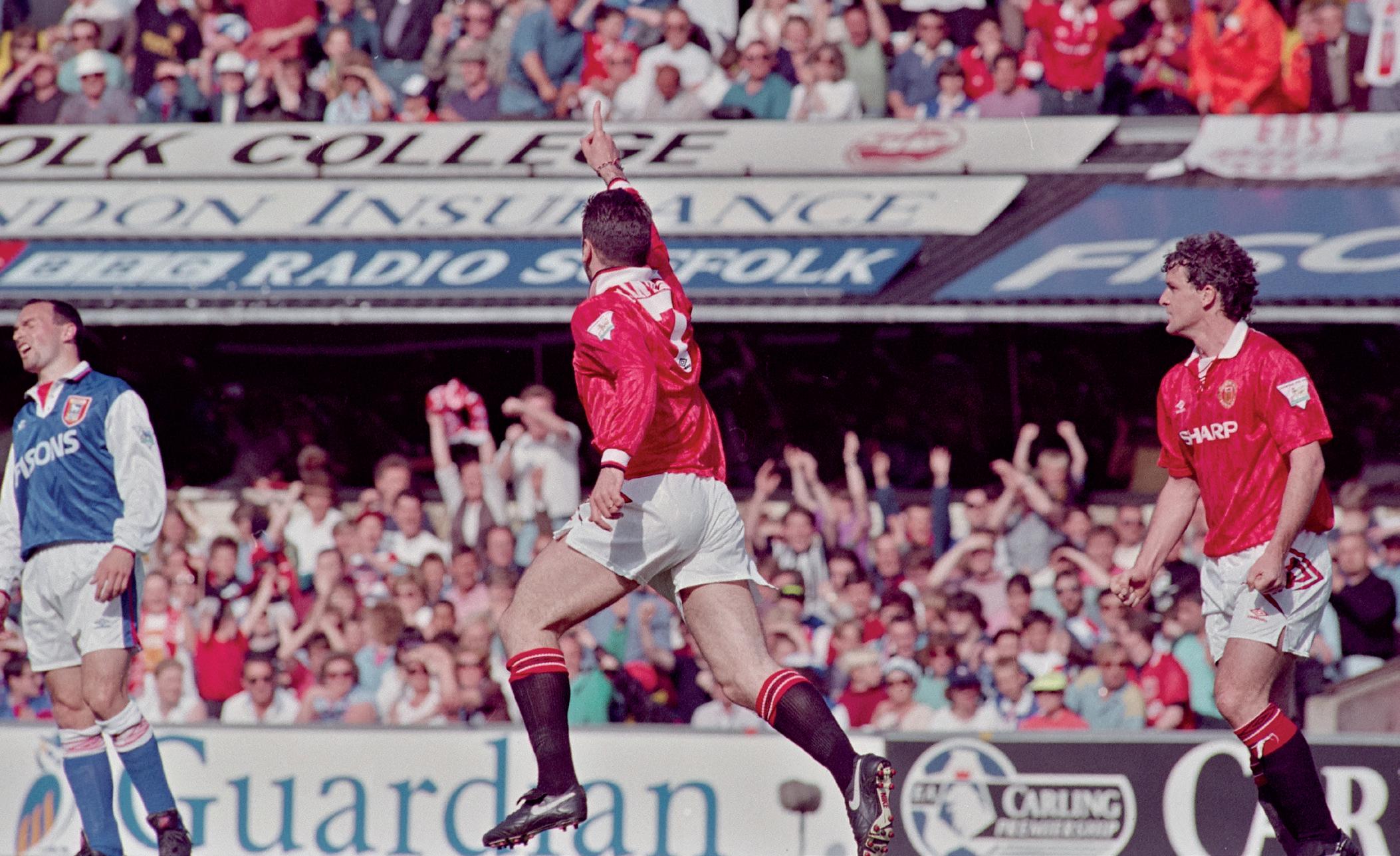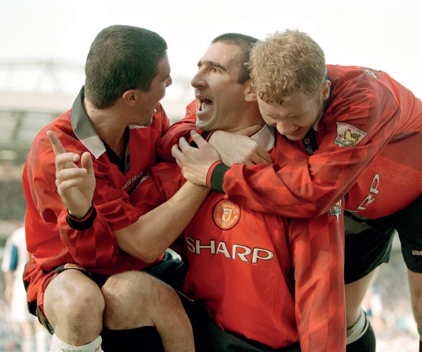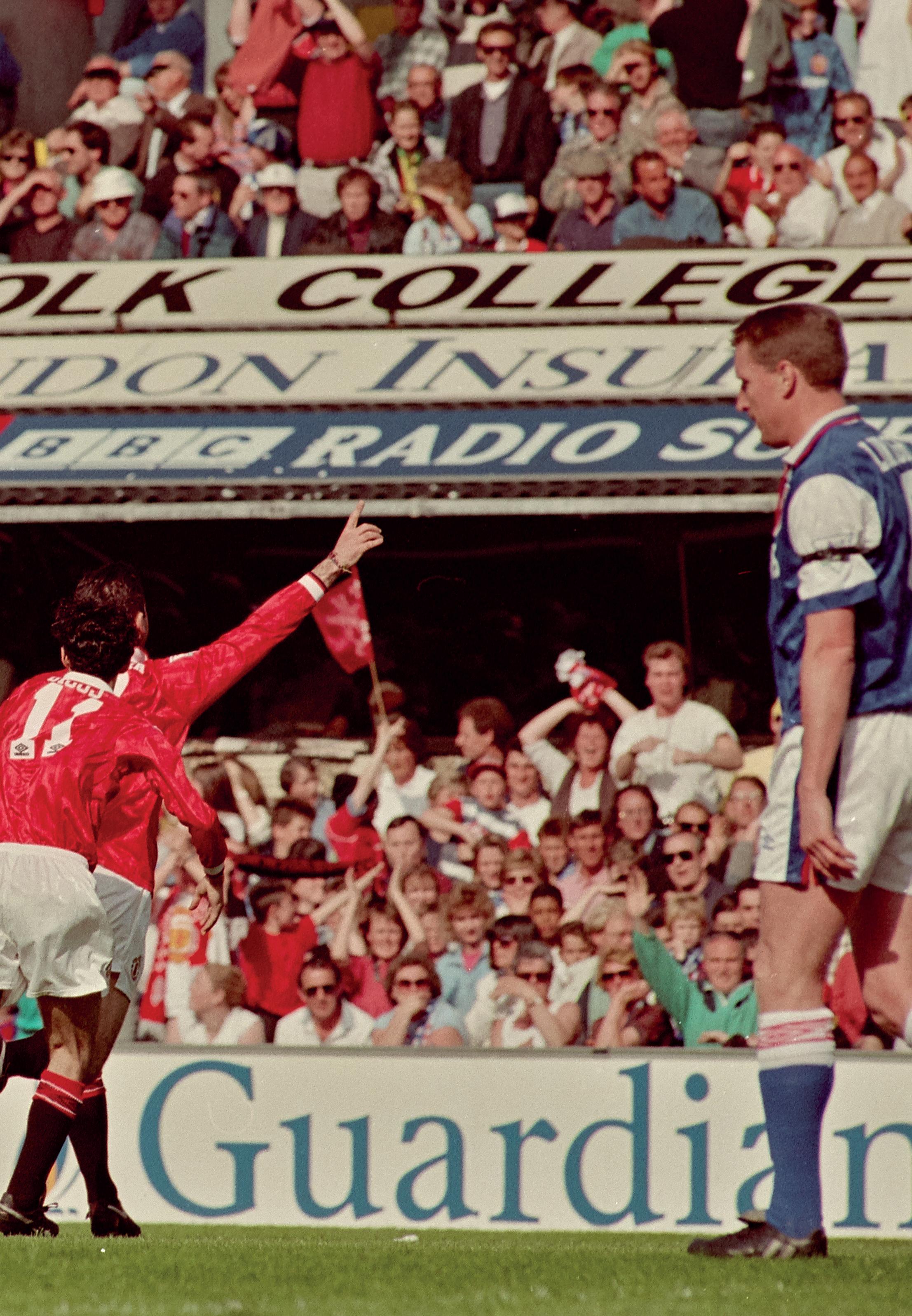 Eric Cantona wheels around towards United’s erupting supporters after a vital equaliser in May ’94...