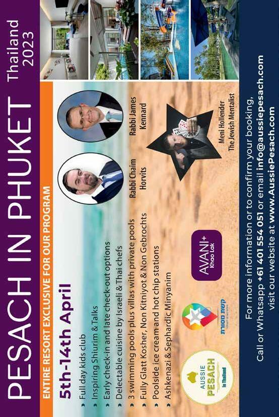 To advertise phone: 0161 708 8877 | E-mail: sales@manjad.co.uk/jewishadvertiser:gmail.com 73 Issue 1131 SPA ד"סב SPA Pesach 2023 April 4th- 14th option until the 16th TRAVELLUX luxury kosher tours Enjoy a tranquil Travellux Pesach featuring the utmost in elegance and personal service, overlooking the beautiful valley in the pearl of the Ardennes, Belgium. Exclusive five star dining no kitniyos, no gebrochts Conveniently located Elegant & modern guest rooms State-of-the-art facilities Pool and wellness area Entertainment & Activities Shiurim & Kids club EU+32 487 938 066 USA +1 929 383 5773 www.travelluxtours.com info@travelluxtours.com Under the strict Hashgocho of R’ A. Y. Schwartz of Vienna ןעפרעווטנא תדה יקיזחמ תידרחה הליהקה םע םואיתב