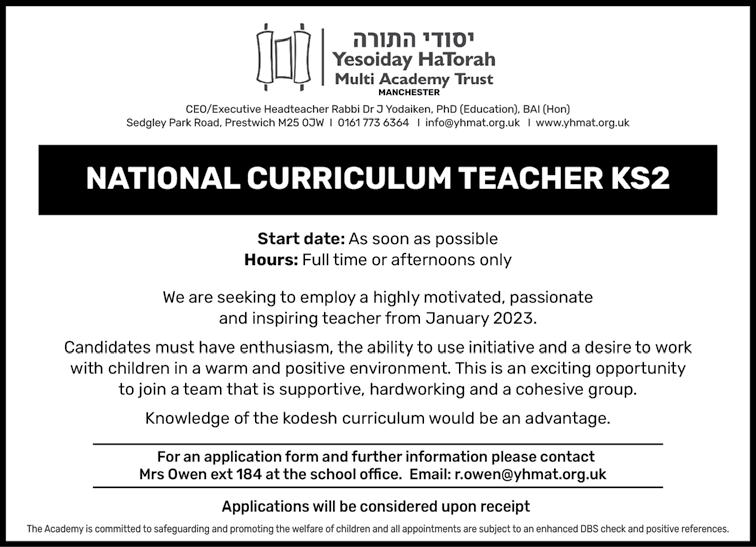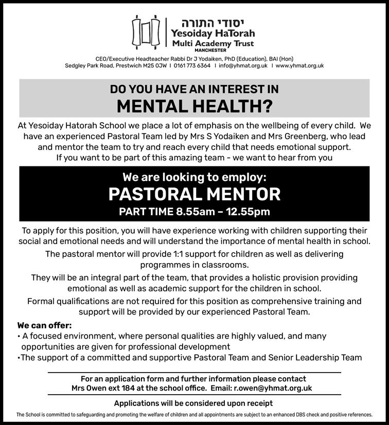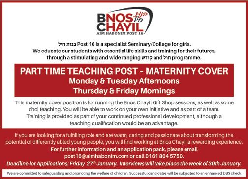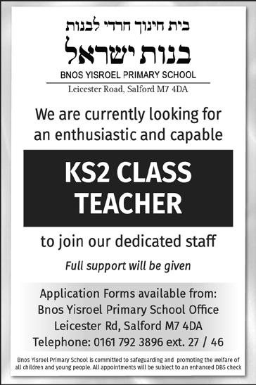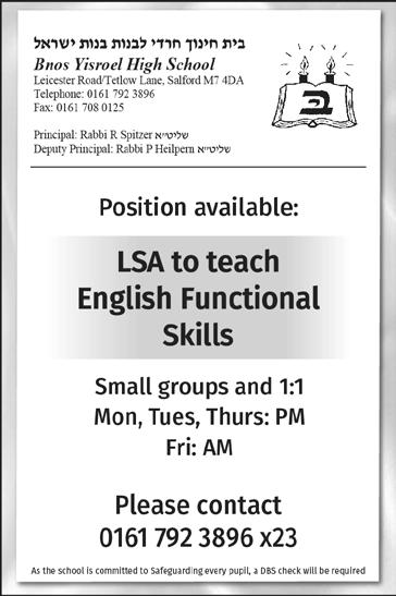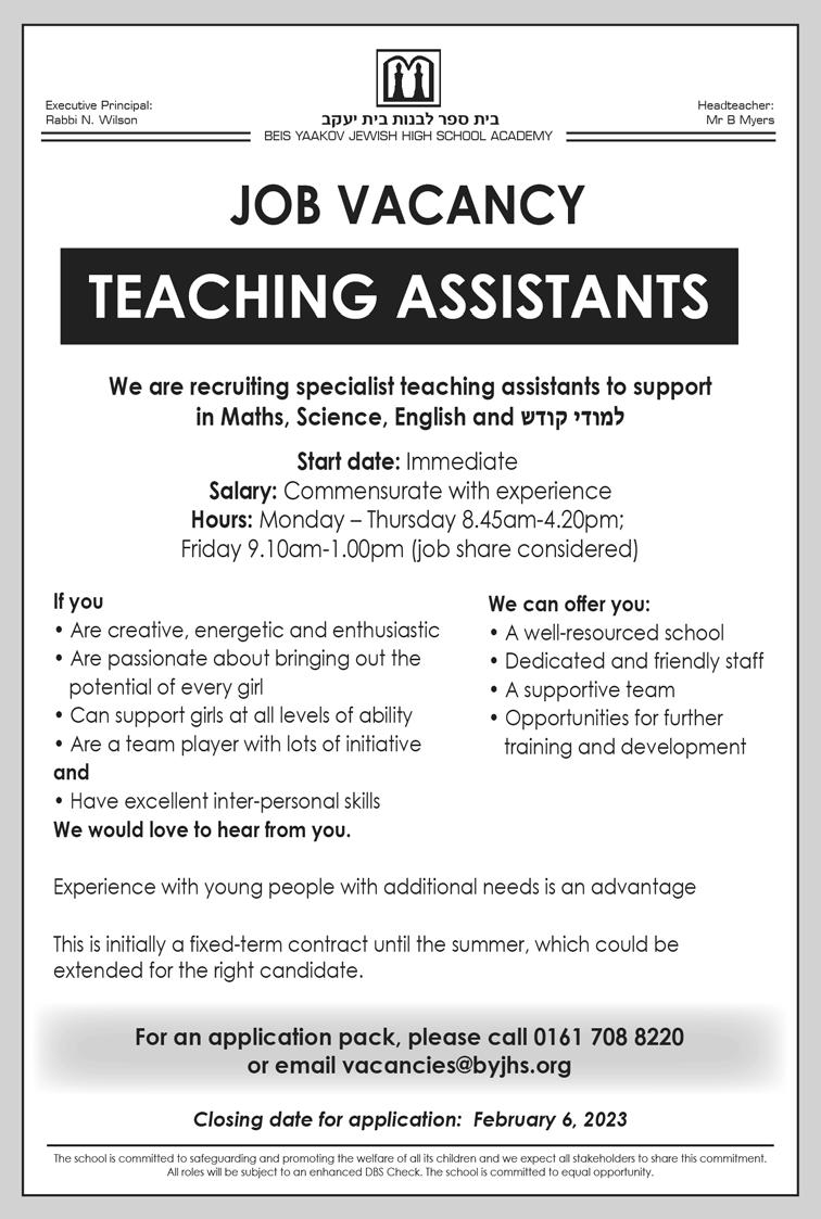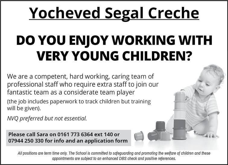 65 Issue 1131 ד"סב הרות דומלת םירענ ךוניח ו"צי רטסעשנאמ For more information, please call the Early Years office on 792 9292 Ext 5, email to: ttcneyoffice@gmail.com or call/text 07816138247. TEACHING POSITIONS AVAILABLE Opportunity to join our Early Years, Key Stage 1 Department 11 Wellington Street East, Salford M7 2AU Assistant Teacher 'ב התכ 1:50PM – 3:20PM Immediate start Lead/Main Teacher 'א ןג Level 3 preferred Immediate start We are committed to safeguarding and promoting the safety and welfare of children Successful applicants will be subject to an enhanced DBS check. Full support and training will be given.