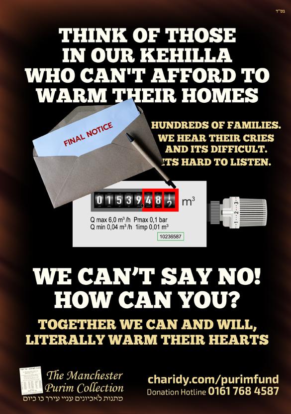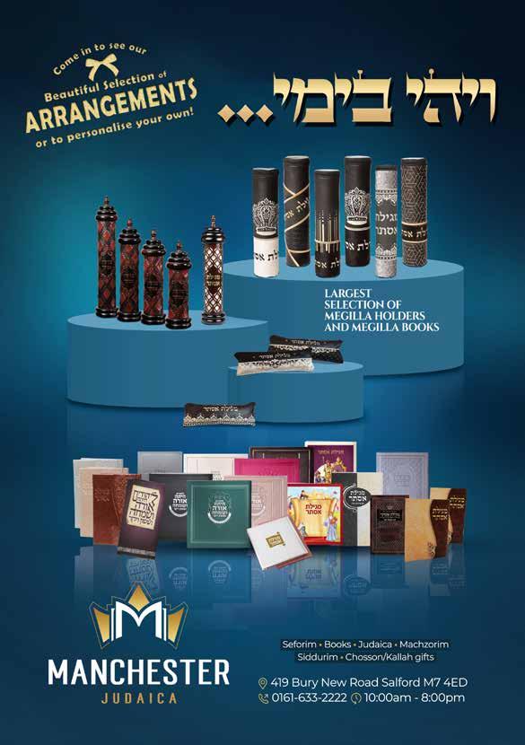PLEASE NOTE ©: No part of this publication may be reproduced. All artwork is protected under copyright laws and under no circumstances may it be used unless requested and authorised in writing from the editor. The editor reserves the right to alter any submissions as seen fit, and will not be held responsible. The editor cannot be held responsible for consequences resulting in the publication of an advertisement. No re-publication or refunds will be offered in the case of minor errors that have no effect on the content of the advertisement. The Manchester Jewish Advertiser accepts no responsibility for the Kashrus of any product advertised in this publication.