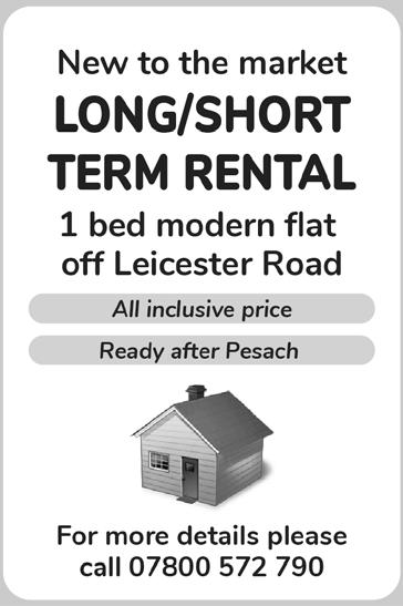 (until Pesach), £195 PCW fully inclusive (rates & Utilities). Immediately available (Tel) 0161 827 1090 (M) 07946600192 ◄