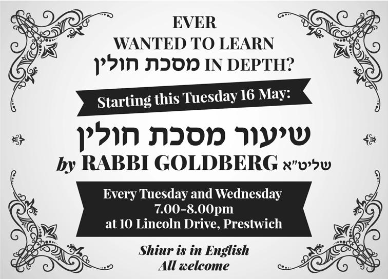 To advertise phone: 0161 708 8877 | E-mail: sales@manjad.co.uk/jewishadvertiser:gmail.com 55 Issue 1145 יביﬤרה ושרד הרורב הנשמ רועיש ימוי דומע 10:20pm Mishna Brura Dirshu Shiur ךילהאב רכששי ללוכ All Day Kollel Yissochor B’Oholecha