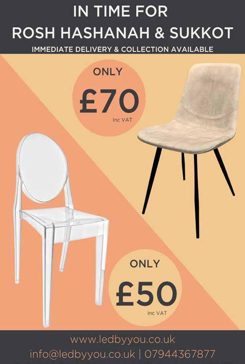 To advertise phone: 0161 708 8877 | E-mail: sales@manjad.co.uk/jewishadvertiser:gmail.com 61 Issue 1162 Be Prepared for Yom Tov 342 Great Clowes Street Tel: 07525 747 908 Opening Times Sun 12 - 3PM Mon - Thurs 12 - 6PM Tishrei Opening Times Tzom Gedalia 12 - 6PM Erev Yom Kippur Closed 26, 27, 28 Sep 12-6PM Last pick up before sukkos 28 Sep 8PM - 10PM. distinctdesign4625@gmail.com