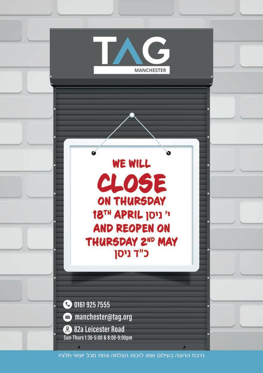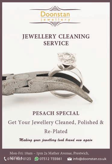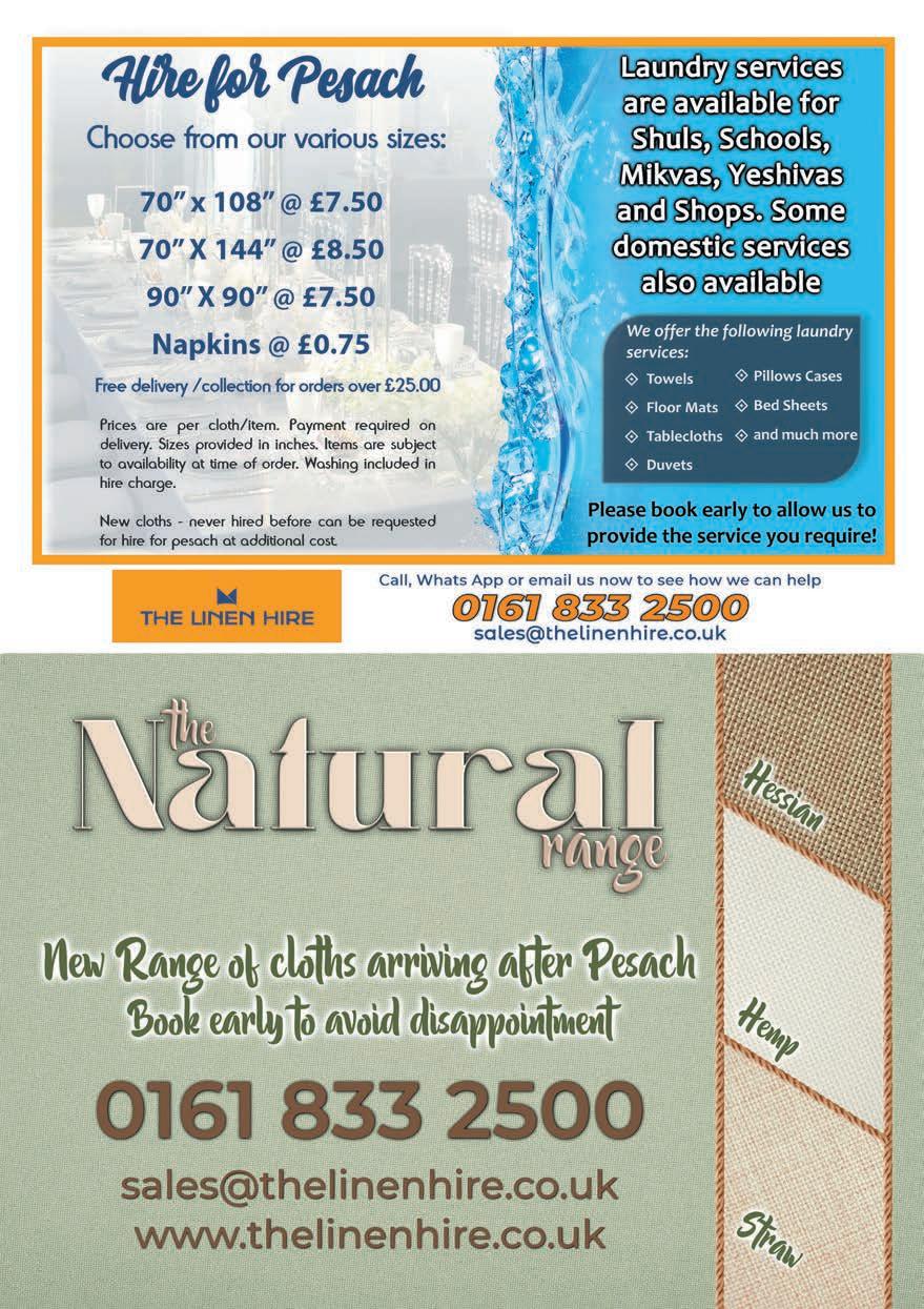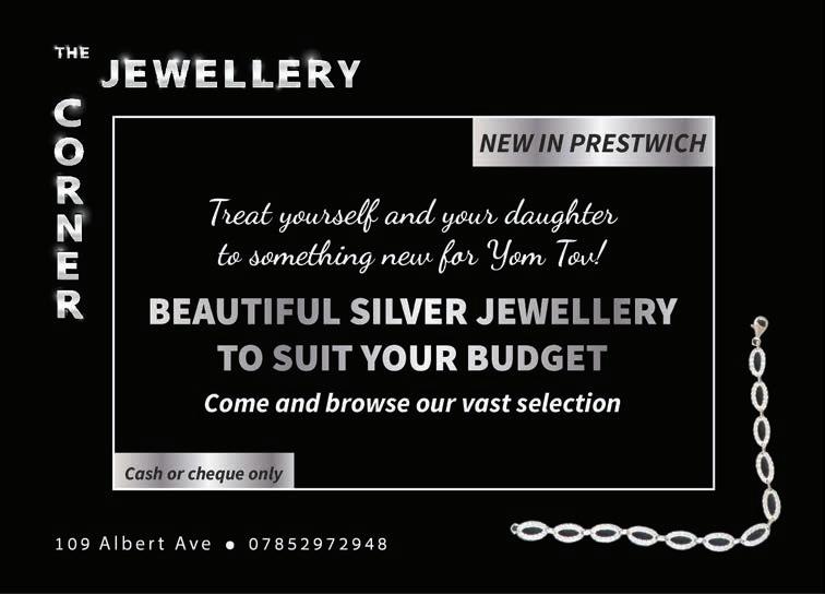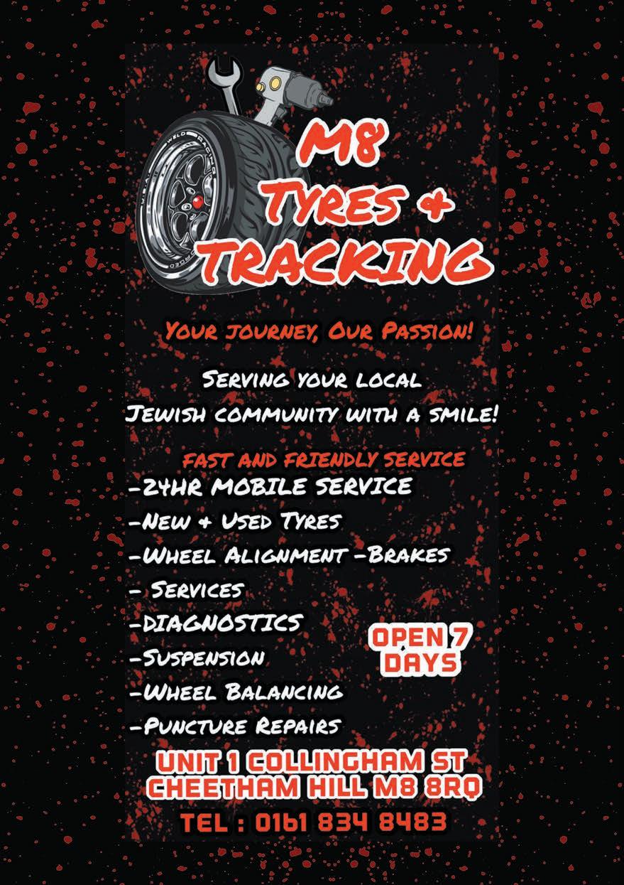 PLEASE NOTE ©: No part of this publication may be reproduced. All artwork is protected under copyright laws and under no circumstances may it be used unless requested and authorised in writing from the editor. The editor reserves the right to alter any submissions as seen fit, and will not be held responsible. The editor cannot be held responsible for consequences resulting in the publication of an advertisement. No re-publication or refunds will be offered in the case of minor errors that have no effect on the content of the advertisement. The Manchester Jewish Advertiser accepts no responsibility for the Kashrus of any product advertised in this publication. Published by