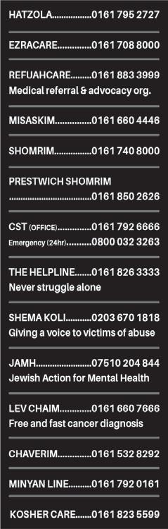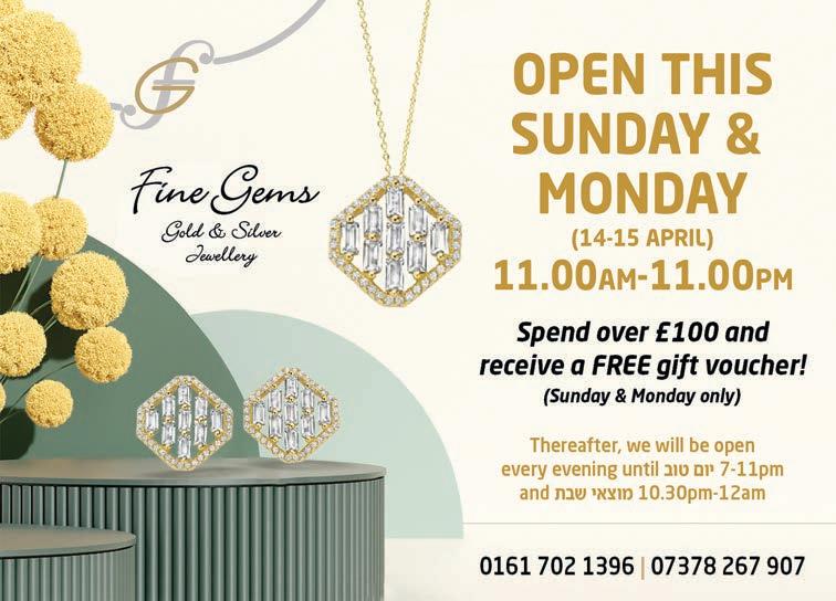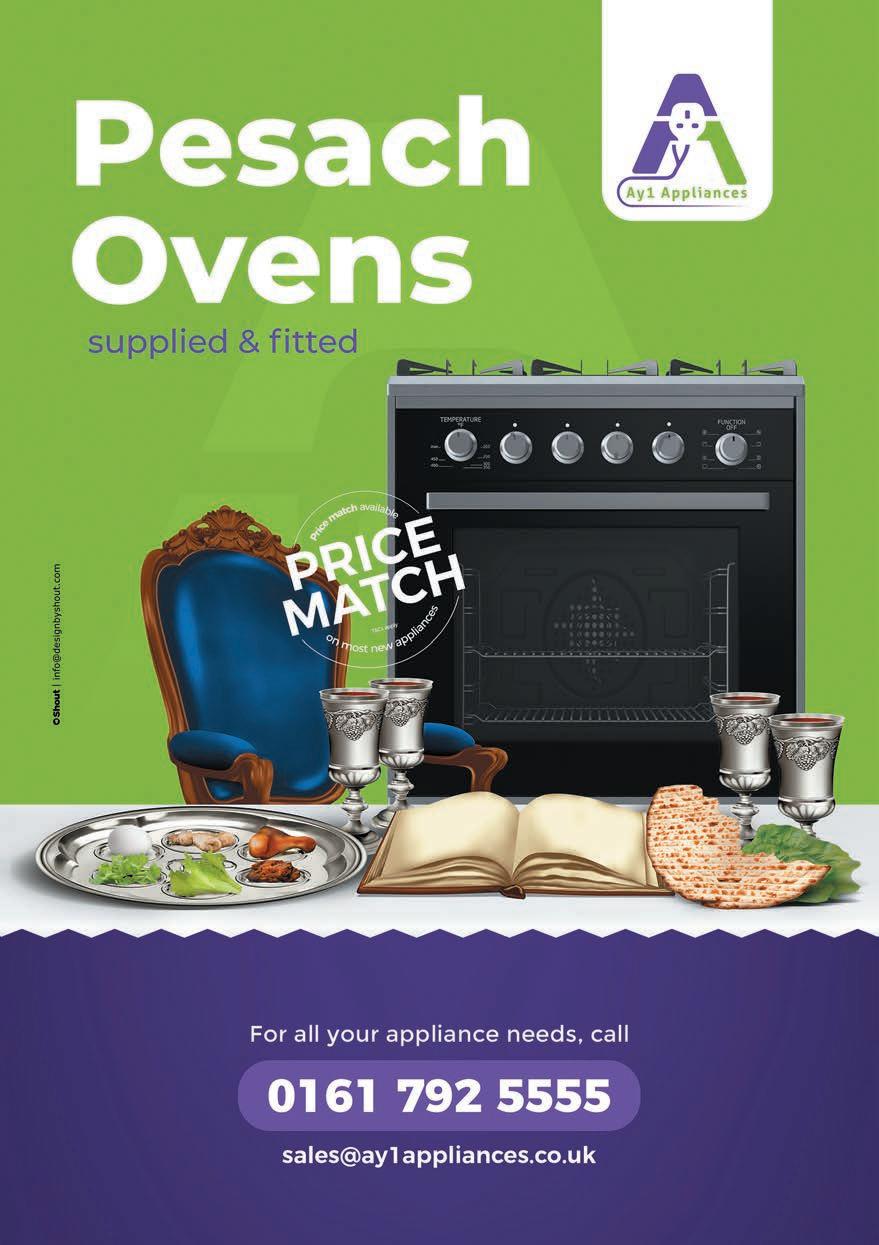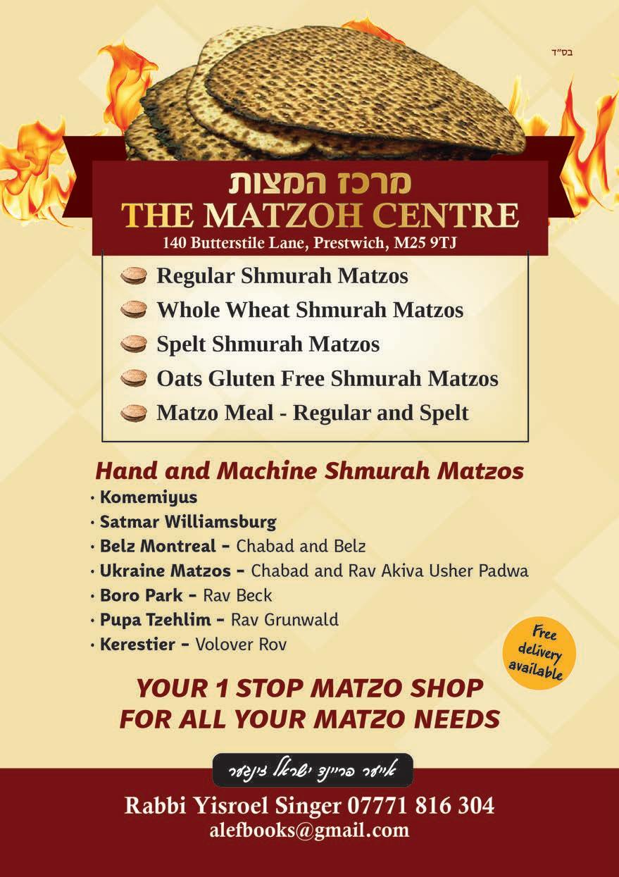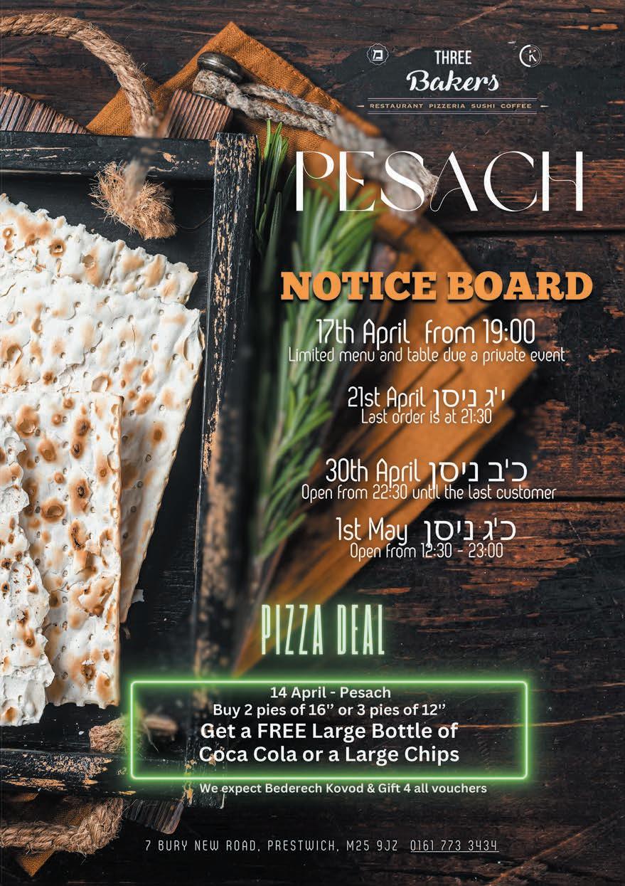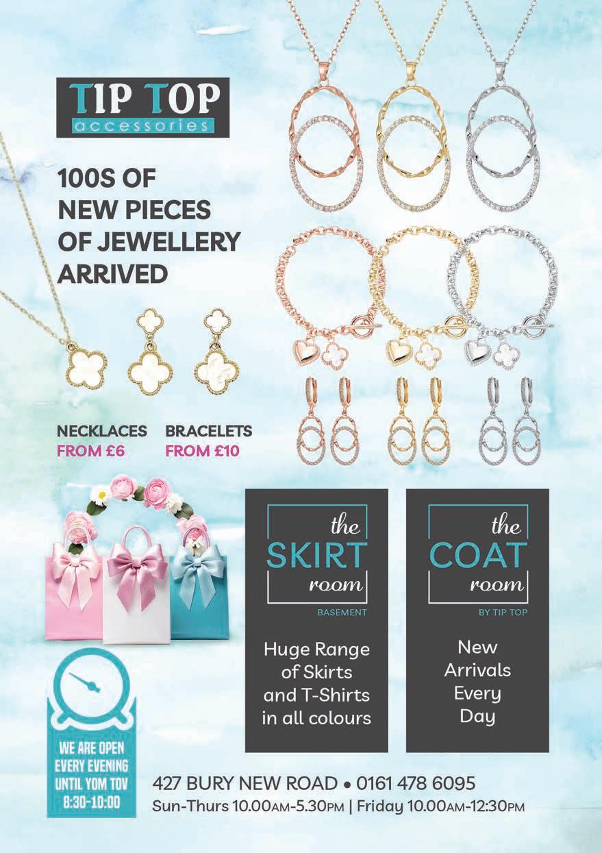 PLEASE NOTE ©: No part of this publication may be reproduced. All artwork is protected under copyright laws and under no circumstances may it be used unless requested and authorised in writing from the editor. The editor reserves the right to alter any submissions as seen fit, and will not be held responsible. The editor cannot be held responsible for consequences resulting in the publication of an advertisement. No re-publication or refunds will be offered in the case of minor errors that have no effect on the content of the advertisement. The Manchester Jewish Advertiser accepts no responsibility for the Kashrus of any product advertised in this publication. Published by