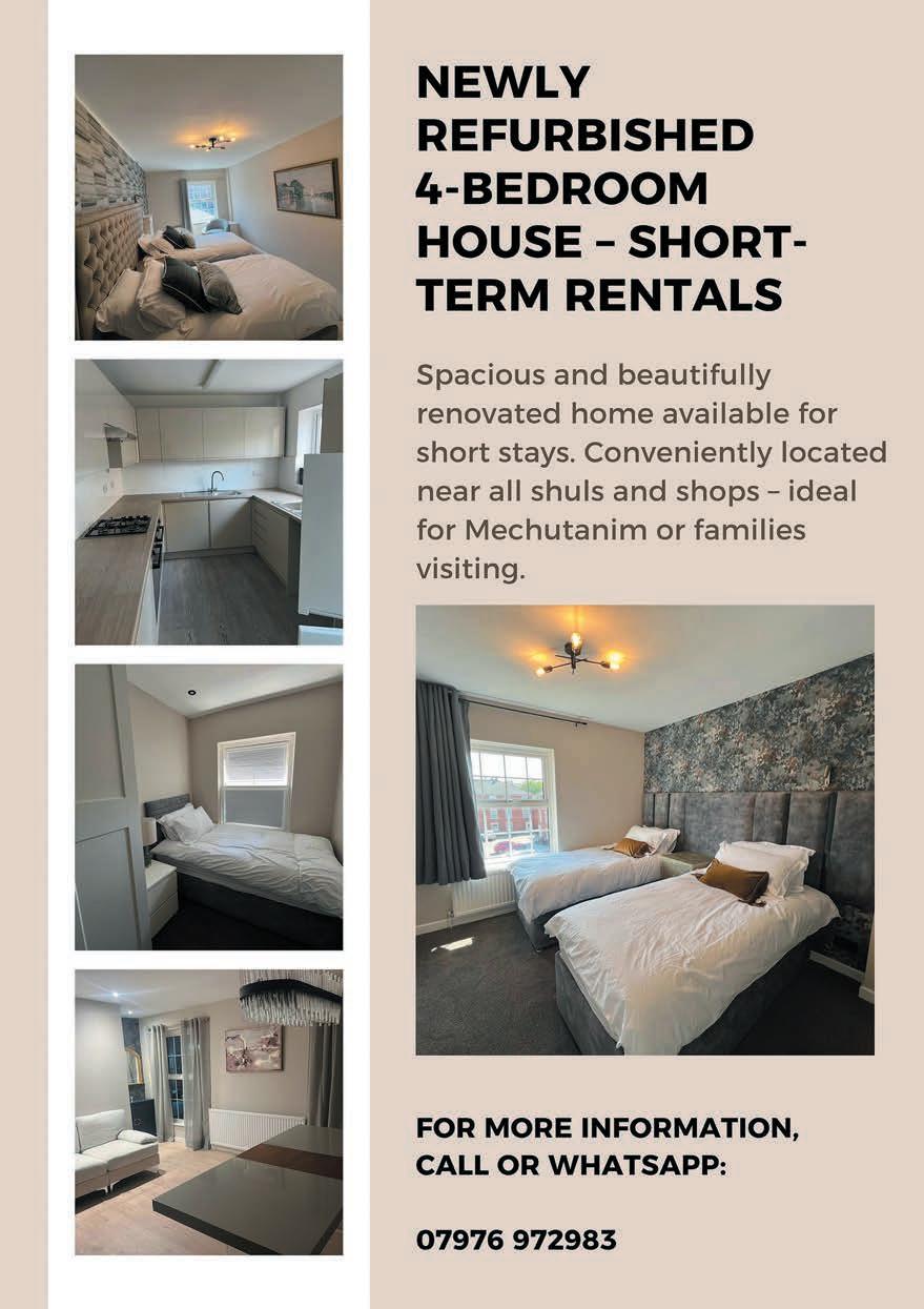 SHORT TERM RENTAL/ MECHUTONIM HOUSE IN PRESTWICH, 4 bedrooms, 7 beds + cot, refurbished, close to shuls and shops, 2 nights minimum, weekly rates. Call 07592 939003 ◄