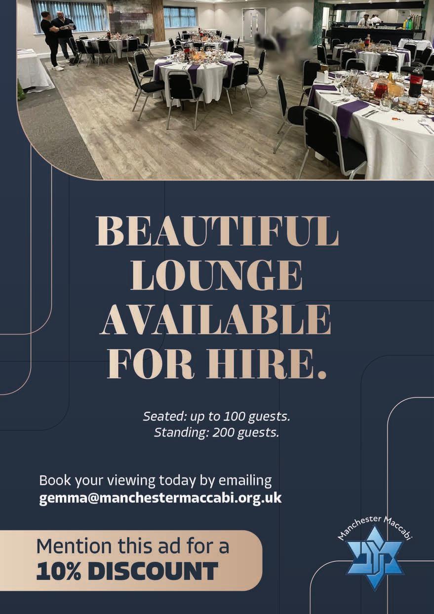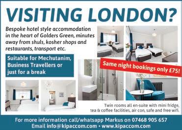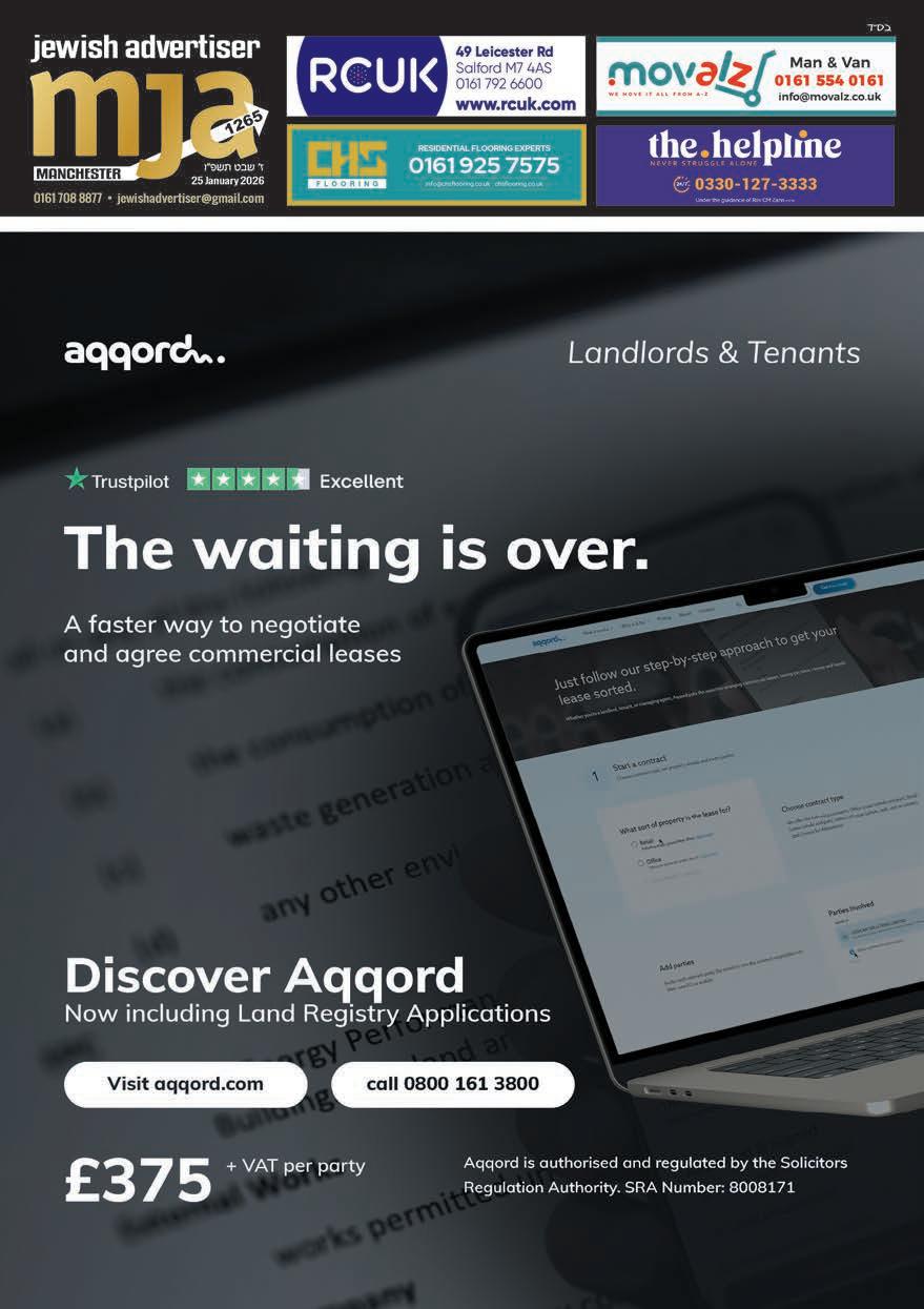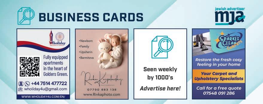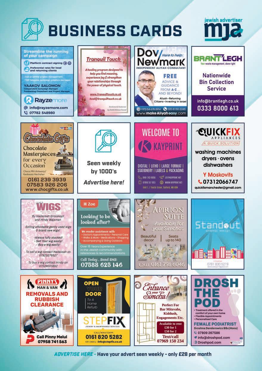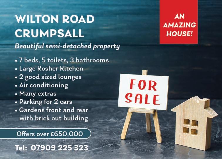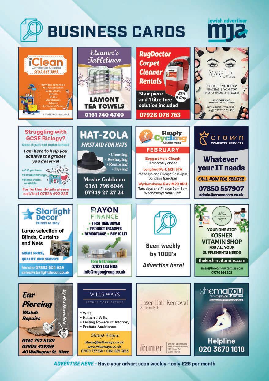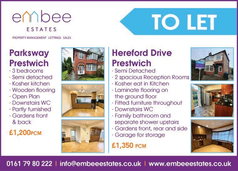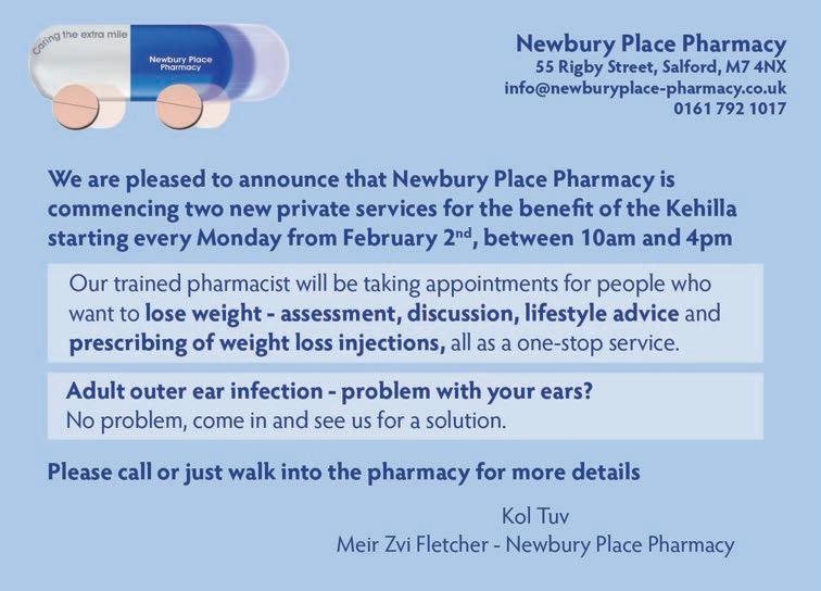 PLEASE NOTE ©: No part of this publication may be reproduced. All artwork is protected under copyright laws and under no circumstances may it be used unless requested and authorised in writing from the editor. The editor reserves the right to alter any submissions as seen fit, and will not be held responsible. The editor cannot be held responsible for consequences resulting in the publication of an advertisement. No re-publication or refunds will be offered in the case of minor errors that have no effect on the content of the advertisement. The Manchester Jewish Advertiser accepts no responsibility for the Kashrus of any product advertised in this publication.