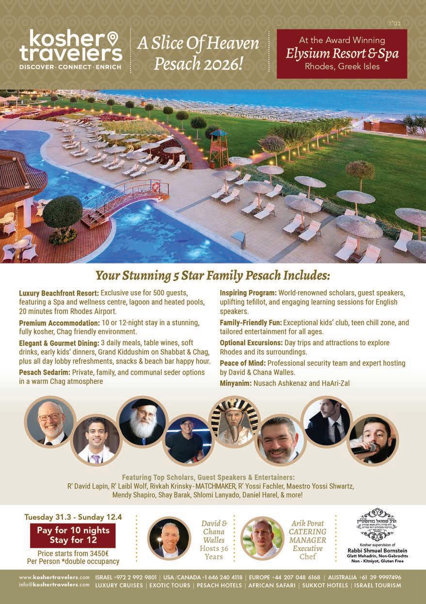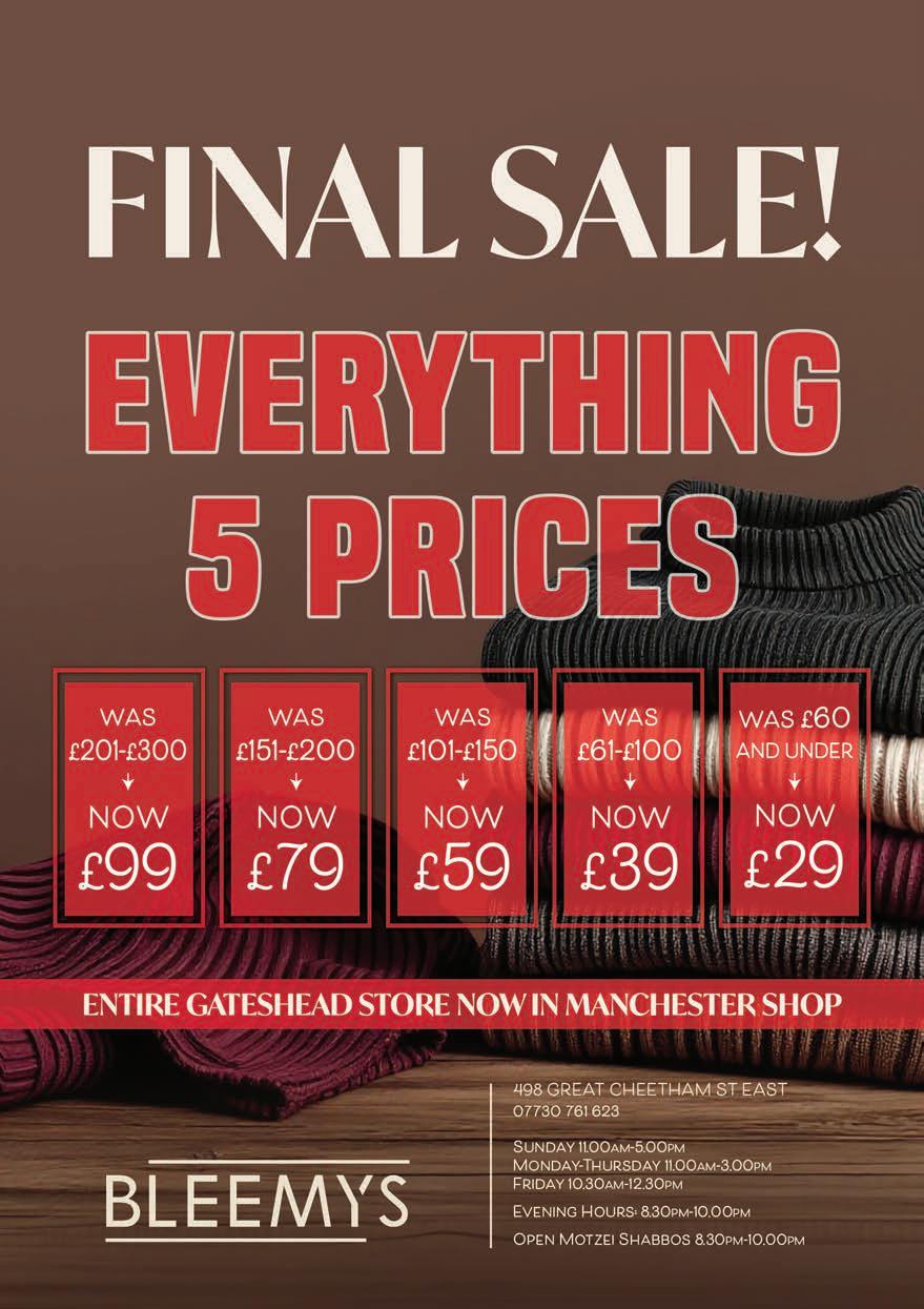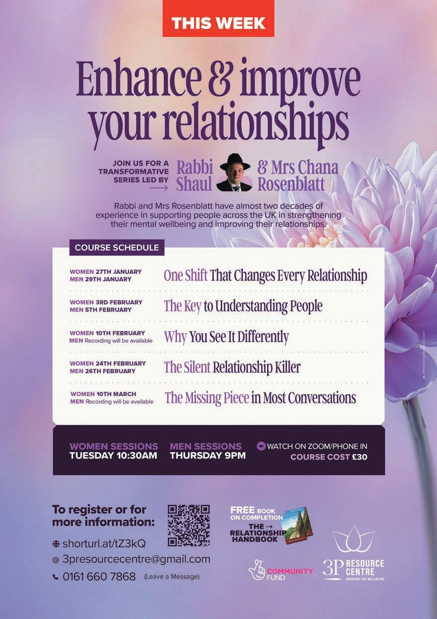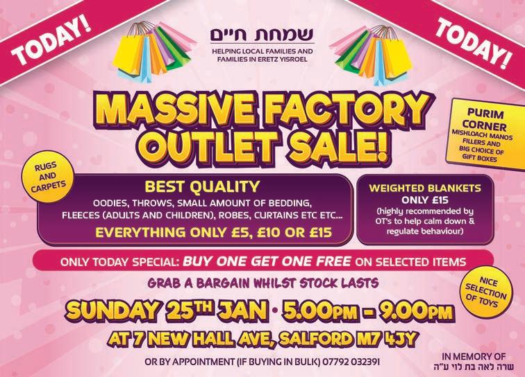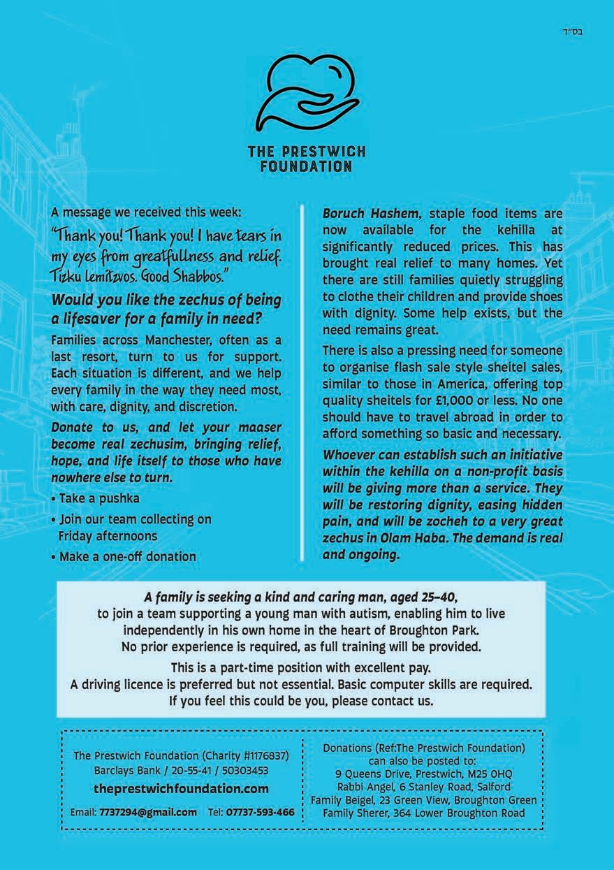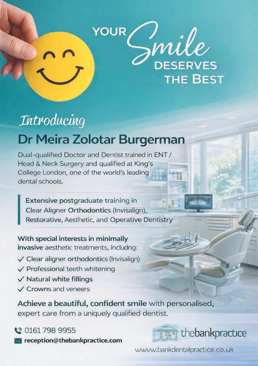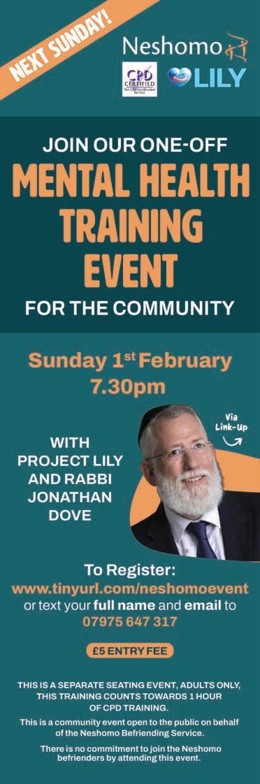 PLEASE NOTE ©: No part of this publication may be reproduced. All artwork is protected under copyright laws and under no circumstances may it be used unless requested and authorised in writing from the editor. The editor reserves the right to alter any submissions as seen fit, and will not be held responsible. The editor cannot be held responsible for consequences resulting in the publication of an advertisement. No re-publication or refunds will be offered in the case of minor errors that have no effect on the content of the advertisement. The Manchester Jewish Advertiser accepts no responsibility for the Kashrus of any product advertised in this publication.