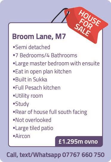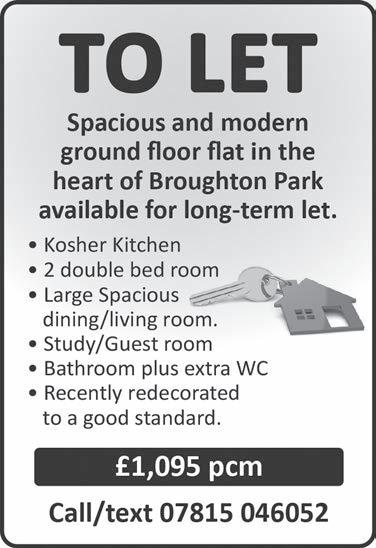 FLAT, ground floor near all the shops and shuls, central Broughton Park (rent rebate accepted) . Call 07837175134 ◄