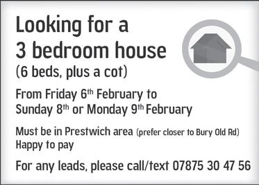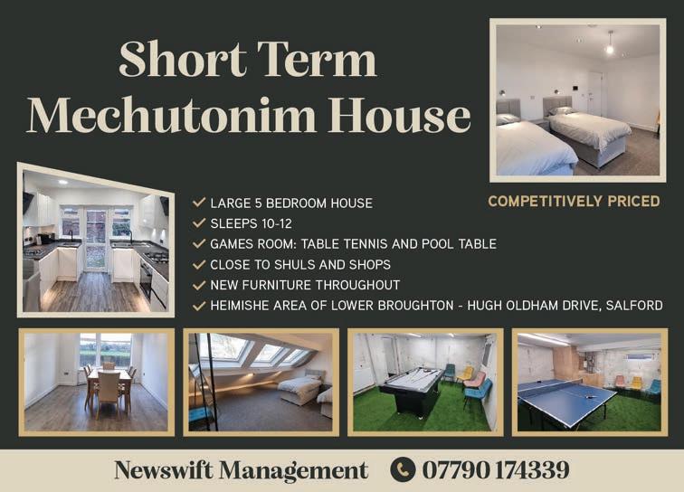 SHORT TERM RENTAL/ MECHUTONIM HOUSE IN PRESTWICH, 4 bedrooms, 7 beds + cot, refurbished, close to shuls and shops, 2 nights minimum, weekly rates. Call 07592 939003 ◄