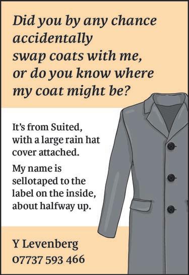 FOUND I by mistake took a mens coat from the Bindinger Tesher chasunah