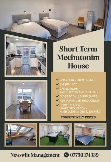 SHORT TERM RENTAL/ MECHUTONIM HOUSE IN PRESTWICH, 4 bedrooms, 7 beds + cot, refurbished, close to shuls and shops, 2 nights minimum, weekly rates. Call 07592 939003 ◄