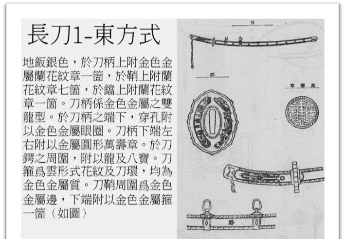 從上述法令原文可以看出,滿洲帝國皇帝佩刀之東方式長刀,是以日本 刀(法令雖無具體說明,但如圖所示應爲太刀)與傳統淸刀之長刀結合設計 而成。其與昭和天皇的天皇佩刀外形差別不是很大,主要的差異體現在刀鞘、 刀柄等處的紋章。天皇佩刀尙簡約,而滿洲國皇帝東方式佩刀的花紋華麗, 且大量采用龍紋、八寶等東方傳統祥瑞元素,且以萬壽章爲刀柄之底左右裝 飾。