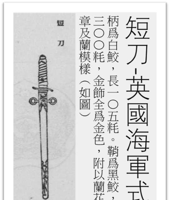 從上述法令原文可以看出,該短刀/短劍就是傳統的英國海軍制式,柄 爲白鮫,鞘爲黑鮫。除蘭花紋章以及蘭圖案外幷無添加其他東方元素,亦無 萬壽章做柄底左右之裝飾。