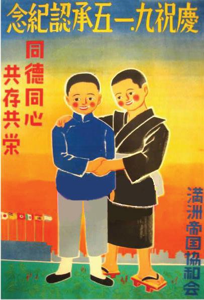 滿洲國乃依三千萬民衆之意志而建設者,內以民衆幸福爲標的,外以國 際親善爲主旨,勵精圖治,期濟大同。