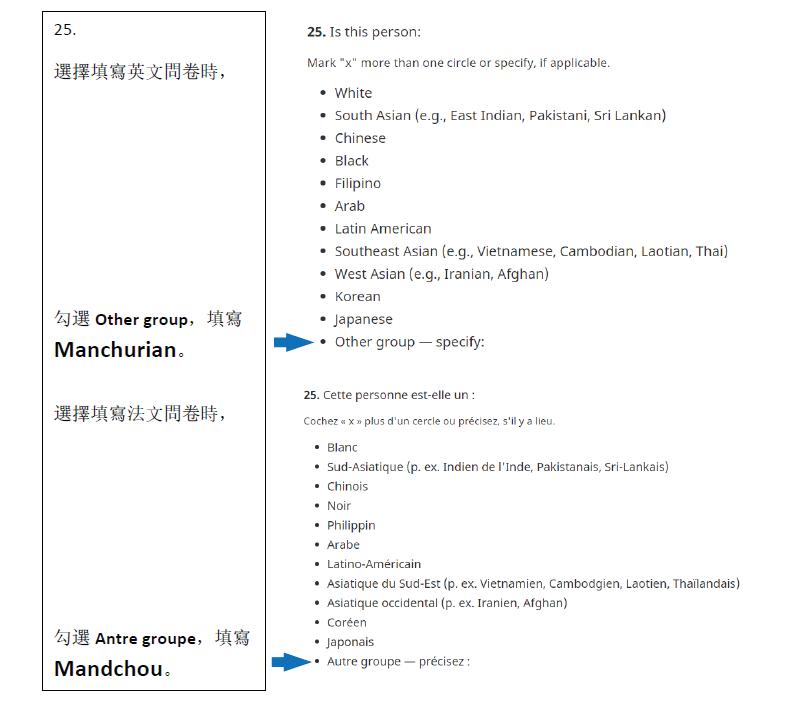 際情況,代替其填寫其族裔爲滿洲(例如Person 1 / Personne 1的未成年子