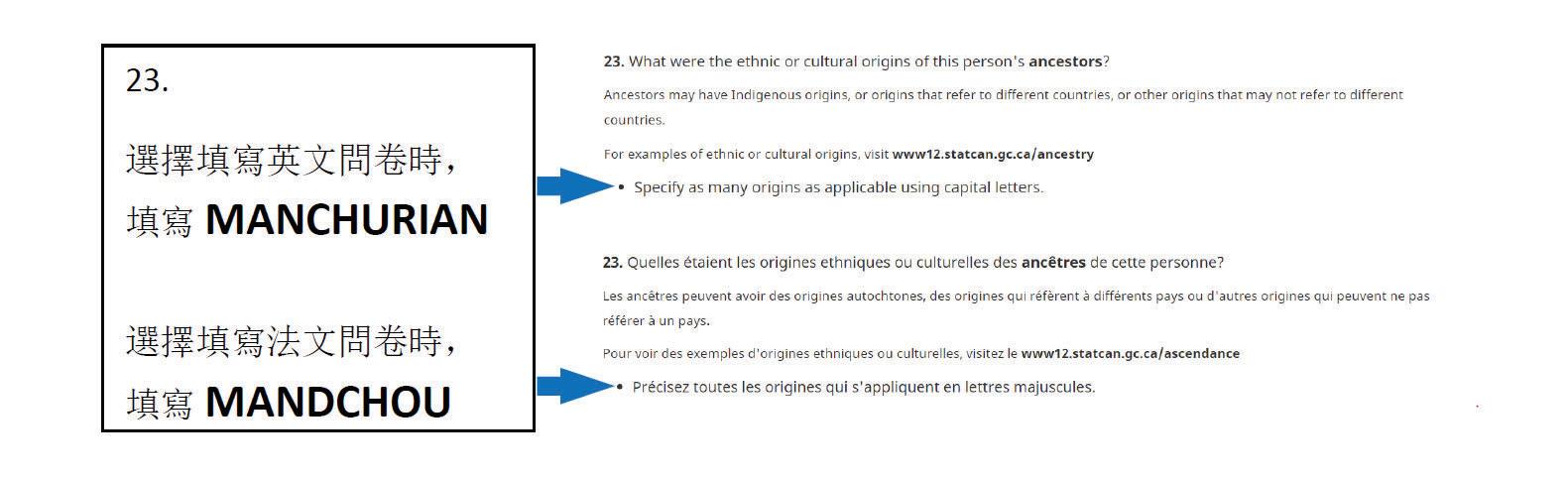 六、收到2A-L或2A-R問卷者,均請遵照本 告之附則,將「滿洲語」以英 文或法文填寫在相應語言的問卷第22題的答案中,將「滿洲人」以英文或法 文填寫在相應語言的問卷第23題以及第25題這兩個問題的答案中。