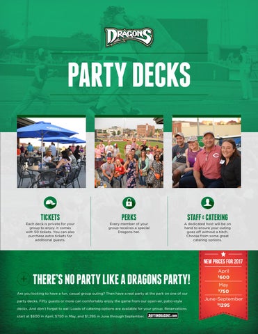 THERE’S NO PARTY LIKE A DRAGONS PARTY! Are you looking to have a fun, casual group outing? Then have a real party at the park on one of our party decks. Fifty guests or more can comfortably enjoy the game from our open-air, patio-style decks. And don’t forget to eat! Loads of catering options are available for your group. Reservations start at $600 in April, $750 in May, and $1,295 in June through September.