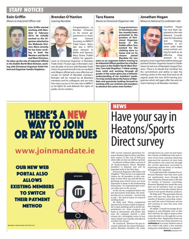 average hours on a year-on-year basis, the creation of additional roles and review of low hour contracts which has improved the contracts of more than 200 members, the union has through the current agreement succeeded in improving income levels of workers throughout the company.” It is understood the company has informed Mandate that they have paid out significantly more through the Sales Incentive Scheme than in the last 12 months of Heatons’ ownership. However, Mandate has raised the issue that not all members have an equal chance to earn from the scheme due to a lack of non-sports Heatons products. Mr Kelly said: “The guarantee that no store will earn less than the last 12 months of Heatons ownership continues until the end of February and we will continue to raise this issue with the company.” He added: “I would encourage all colleagues to join Mandate now so that they will have the right to express their views directly to us through the survey in the New Year. Application forms are available from your shop steward or at JoinMandate.ie is an easy, modern way to join which only takes a few minutes using your smartphone or computer.” SHOPFLOOR