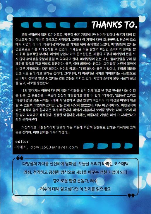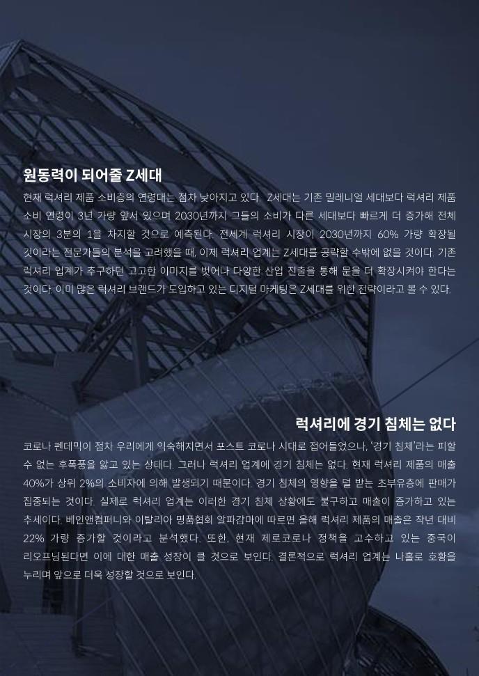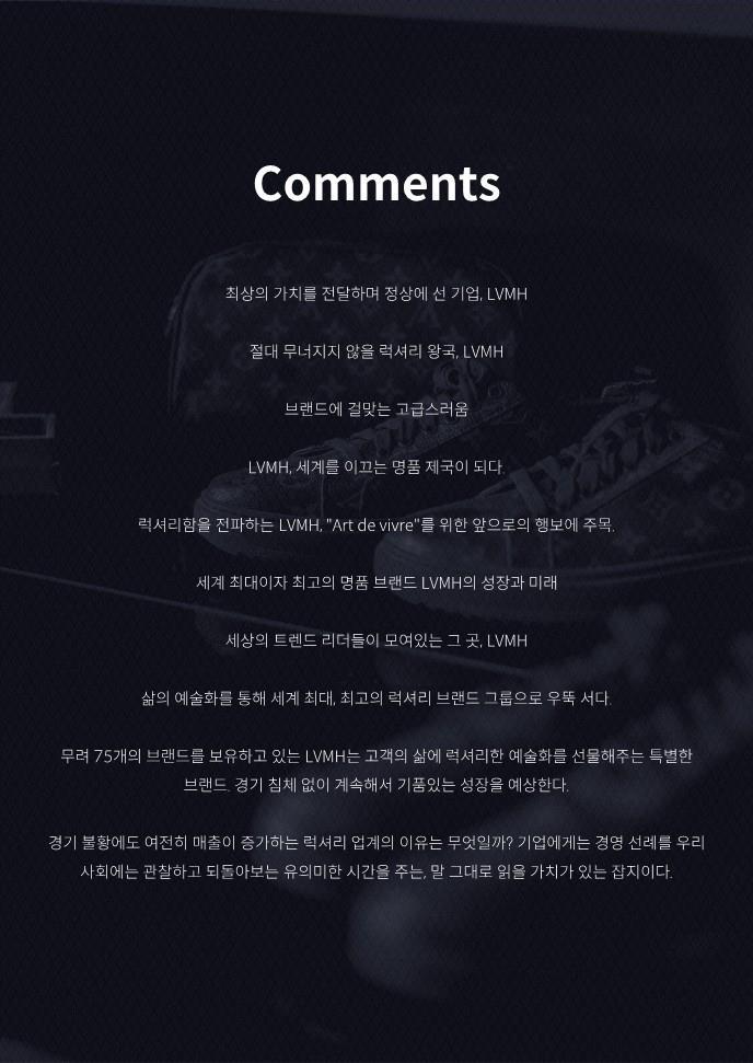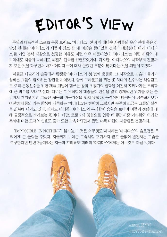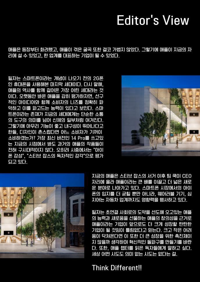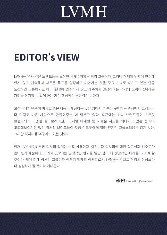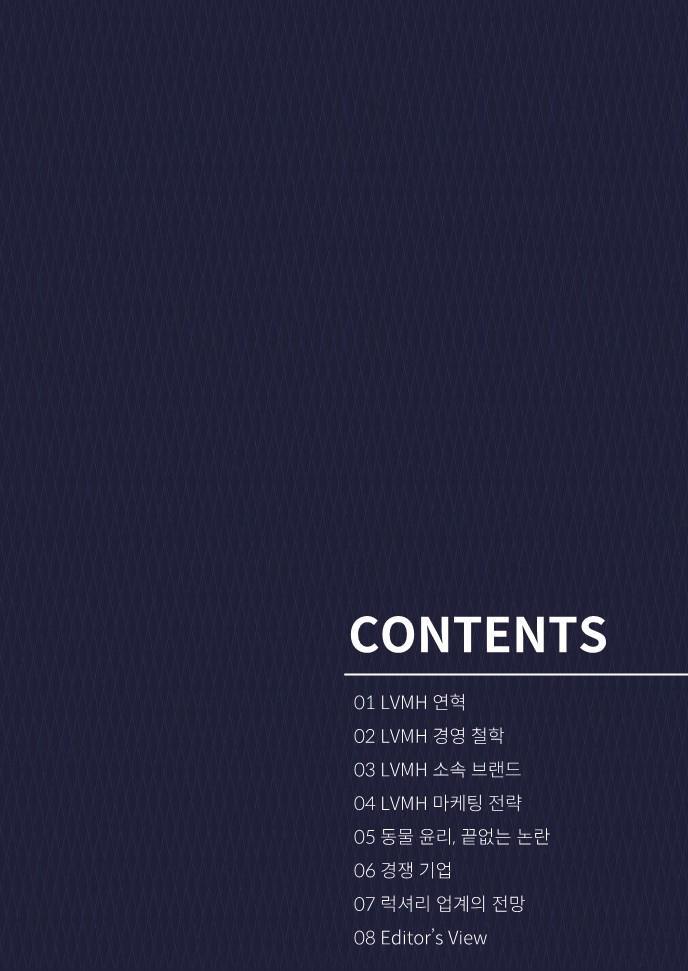 contents EWHAWOMANSUNIVERSITYMANDIA2ND MAGAZINE 1 2 3 4 5 6 ‘ 정직하고 공정한 방식으로 세상을 바꾸는 기업 ’ ‘ 삶을 예술로 변화시키는 럭셔리 그룹 ‘ ‘ 인재와 기술이 그려내는 미래의 청사진 ‘ ‘ 모두의 더 나은 주거 미래를 함께할 기업 ‘ ‘ 애플의 영향력이 당신에게도 미치길 ‘ ‘ 불가능 속 가능성을 보는 또 하나의 스포츠 ‘