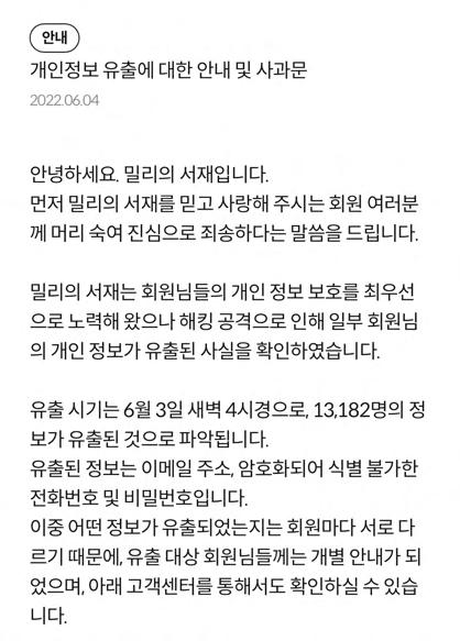 밀리의 서재는 고객의 개인 정보 유출과 관련하여