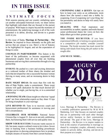 Love, Marriage & Partnership - The Review is a monthly publication sponsored by M & M R Marketing, LLC that focuses on married couples that are in partnership with each other through service and/or business to their communities and abroad. The goal of the Love, Marriage & Partnership – the Review is to inspire readers to look at the essence of partnership in marriage as shared by exemplary couples, ultimately moving readers to actively define, develop, and devote to their purpose as a couple.